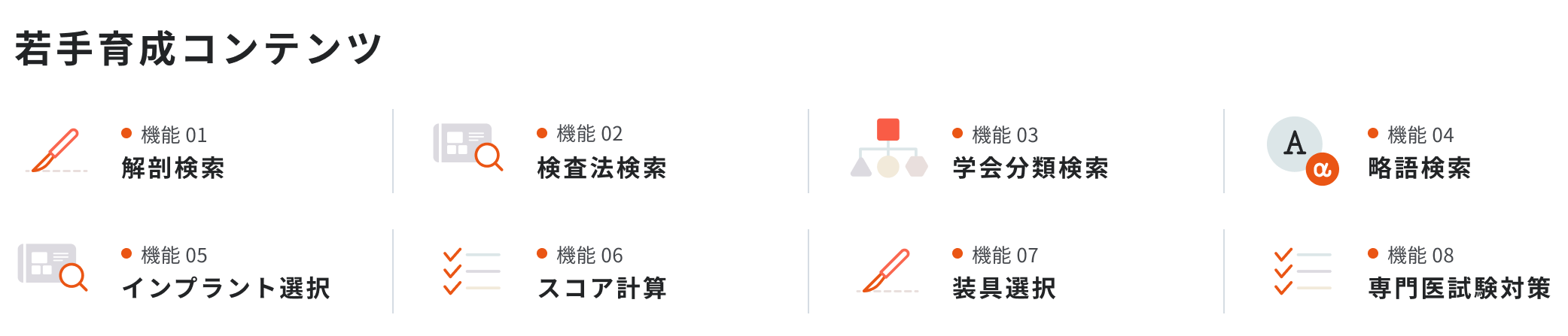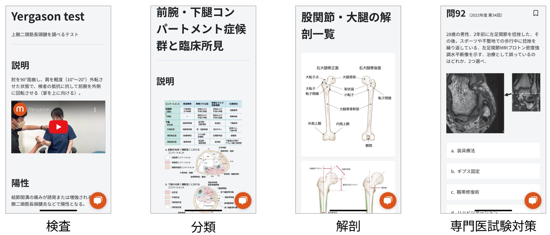本アプリは整形外科医の思考プロセスに従い、身体のパーツごとに「検査」「分類」「手術」「解剖」からそれぞれに関連する情報を検索することができます。紙の参考書、カタログ、PDF、Webサイトなどに散在する情報を一元化・体系化し、整形外科初学者が「これだけは押さえておくべき」という内容を厳選しました。