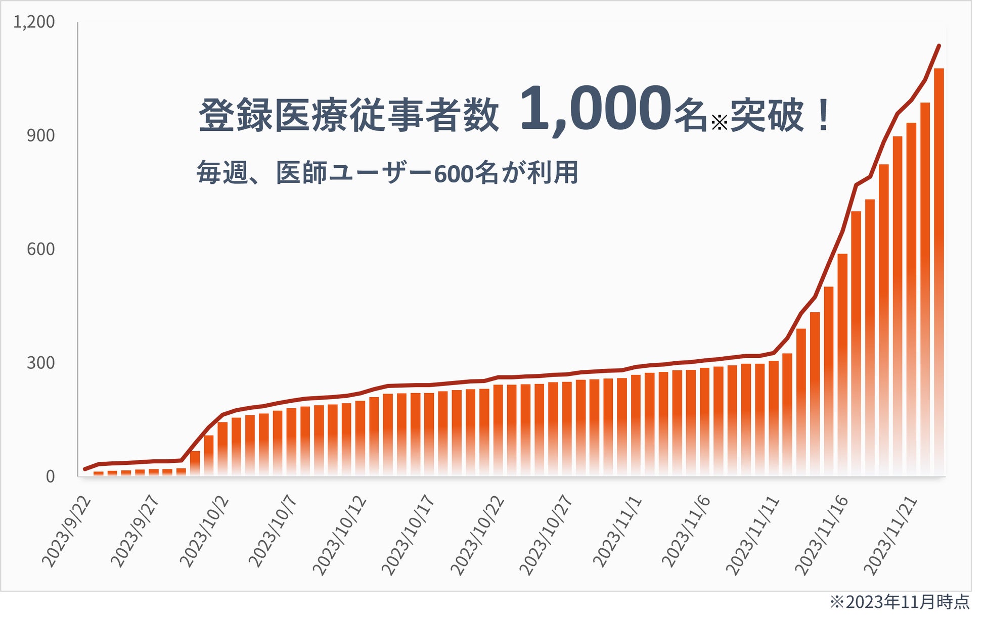 公開後1ヶ月でユーザーが300名、2ヶ月で1,000名を突破。整形外科医をはじめ、内科医、看護師、理学療法士など、整形外科的治療に関わる幅広い職種の医療従事者にご登録をいただいております。週間アクティブ率は60%前後と高水準を推移し、ユーザーの皆様からもご好評いただいております。今後、数々の大型アップデートを控えており、さらなるユーザー増加を見込んでいます。