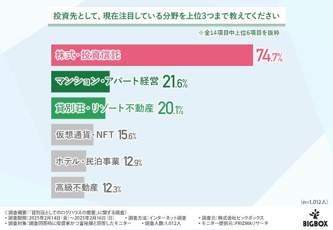 はじめに、「投資先として、現在注目している分野を上位3つまで教えてください」と質問したところ、『株式・投資信託(74.7%)』と回答した方が最も多く、『マンション・アパート経営(21.6%)』『貸別荘・リゾート不動産(20.1%)』と続きました。