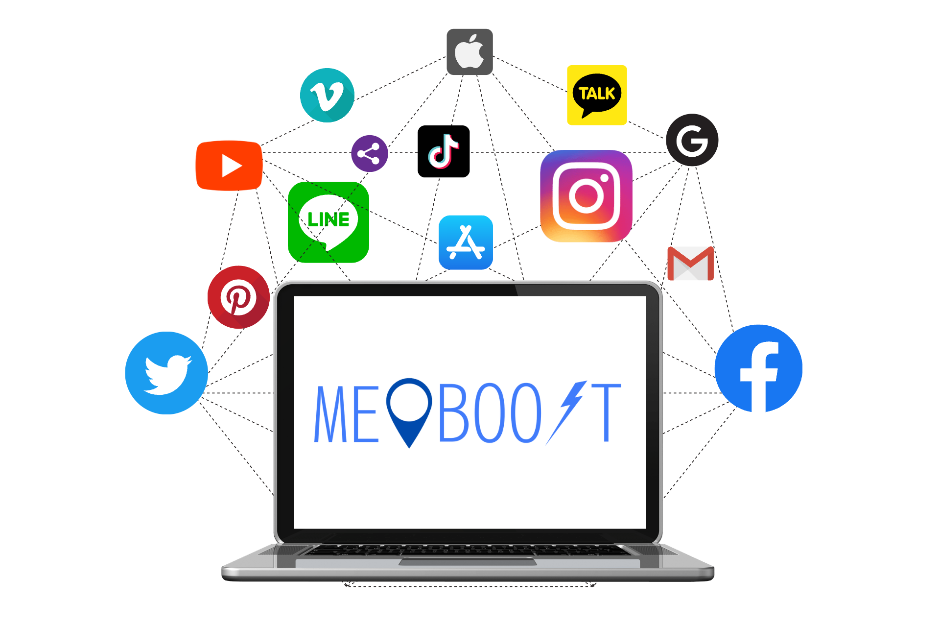 「MEOブースト」は、お店の大事な情報や、Instagram、Facebook、Twitterで配信した内容をそのままGoogleマップにも自動連携配信することが可能です。月間アクティブユーザー9,000万人超の国内最大のSNS、LINEとも連携し、MEOブースト上からLINE公式アカウントへ配信可能です。