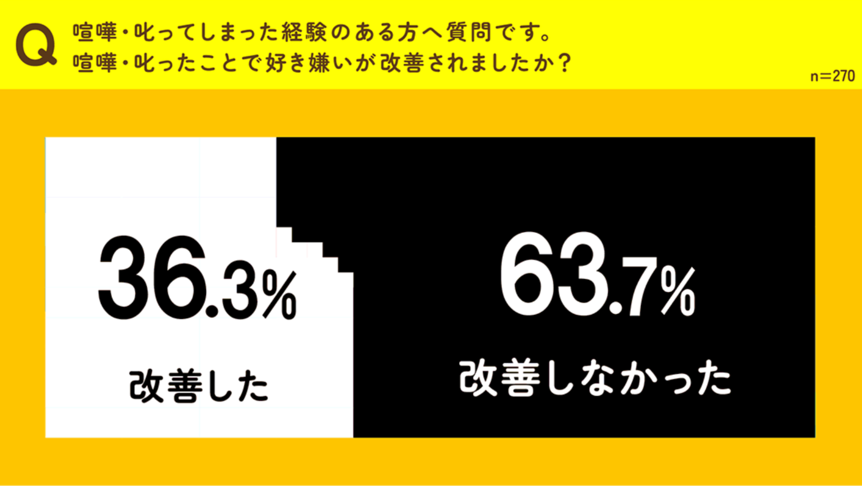 好き嫌いがある子どもをもつ親のうち、59.8%が「子どもの好き嫌いでストレスを感じた事がある」、50.3%が「子どもの好き嫌いで、叱る・喧嘩をした事がある」と回答。その一方で、63.7% が「叱る・喧嘩をしたことで子どもの好き嫌いが改善されなかった」と回答する結果に。子どもの好き嫌いが原因で、ストレスを感じる、叱る・喧嘩をしてしまうものの、好き嫌いの改善には至らないご家庭も多いことが調査で判明しました。