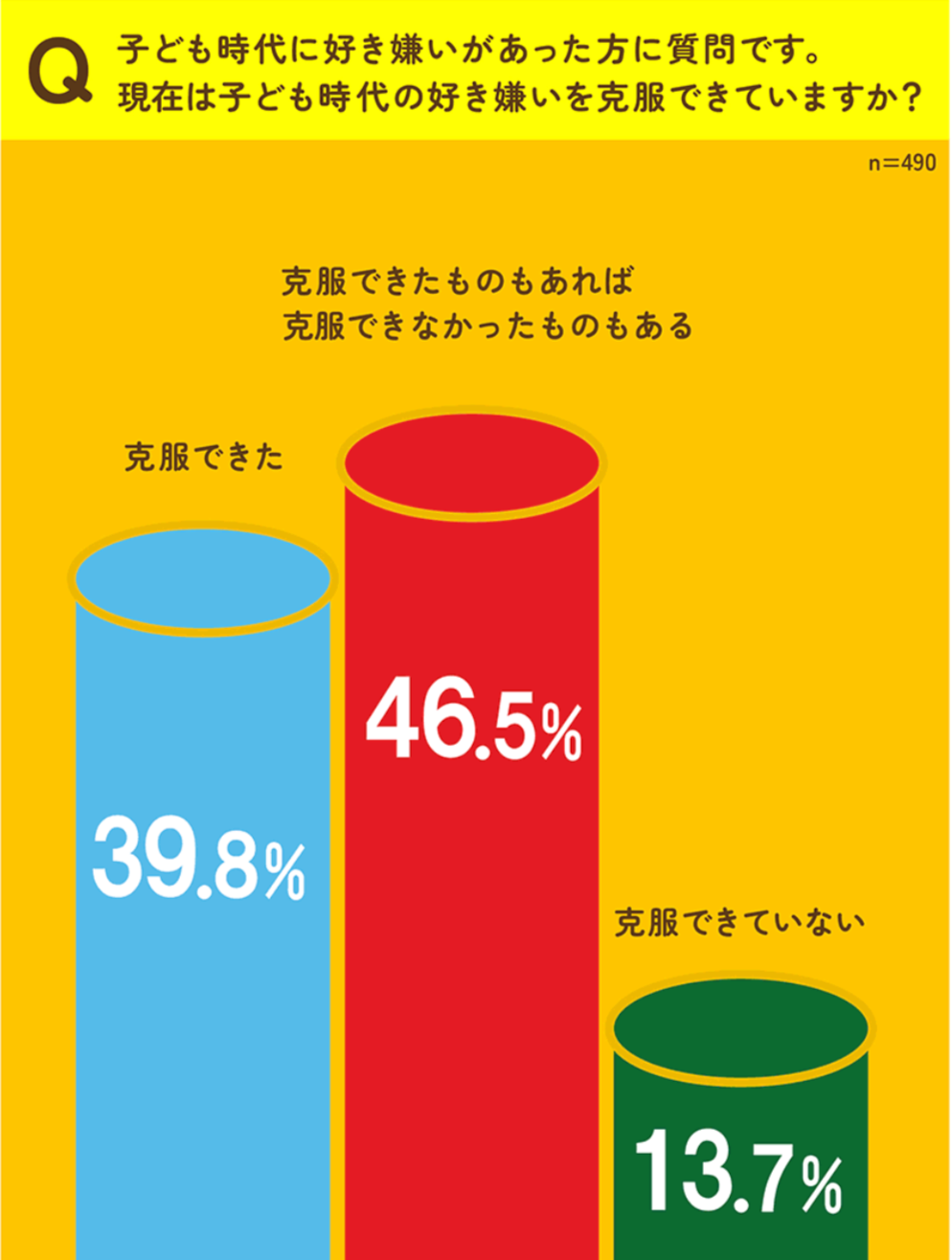 - TOPIC③:親の子ども時代はどうだった?親の幼少期時代の好き嫌いに関する実体験を調査 約8割子どもの頃に好き嫌いがあったが・・・7割以上は「克服できた」経験あり
