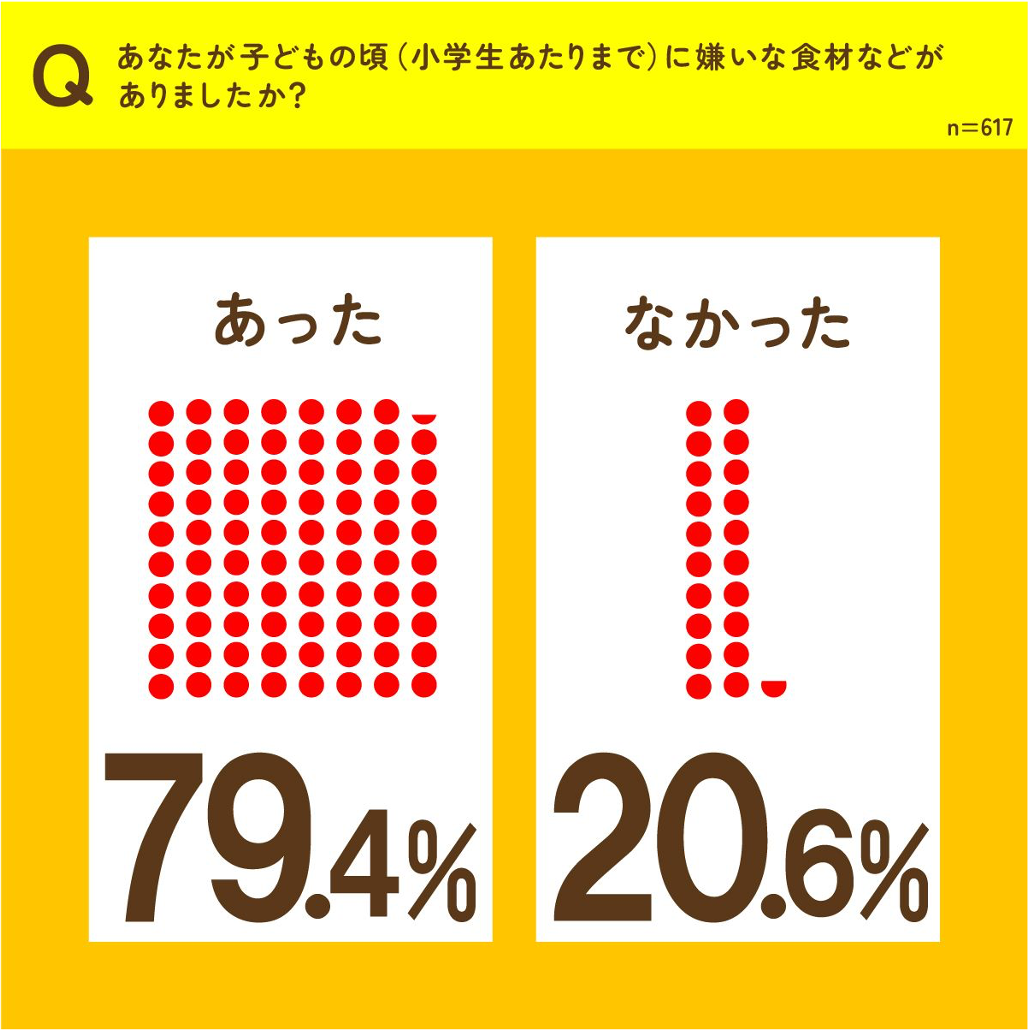 親の幼少期時代の好き嫌いに関する実体験を調査したところ、「自分が子どもの頃に嫌いな食材・料理があった」と回答した親は79.4%と、約8割が好き嫌いがあったことが判明。さらにそのうち61.4%は「現在も嫌いな食材・料理がある」ことがわかりました。また、39.8%の親が「その嫌いな食材は克服できた」、46.5%の親が「一部克服できた」と回答し、子どもの頃に好き嫌いを克服してきた経験があるからこそ、自分の子どもにもの同様に克服させようと思うのかもしれません。