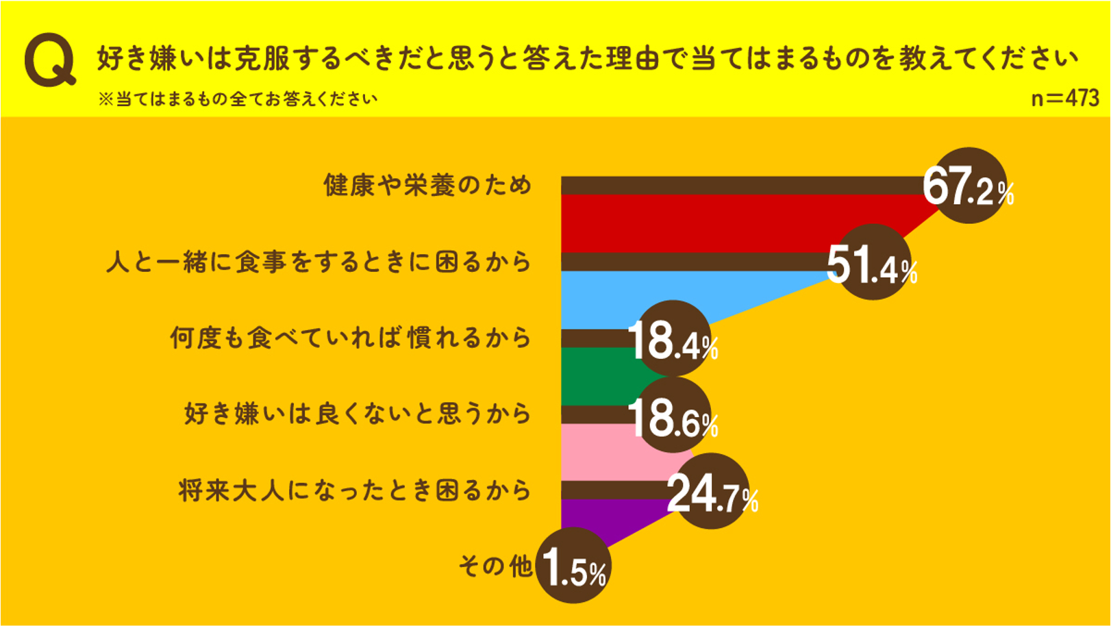 克服すべきと回答した理由として「健康や栄養のため」(67.2%)、克服しなくても良いと回答した理由は「将来大人になっても困らないから」(52.9%)という意見が最も多い結果となりました。