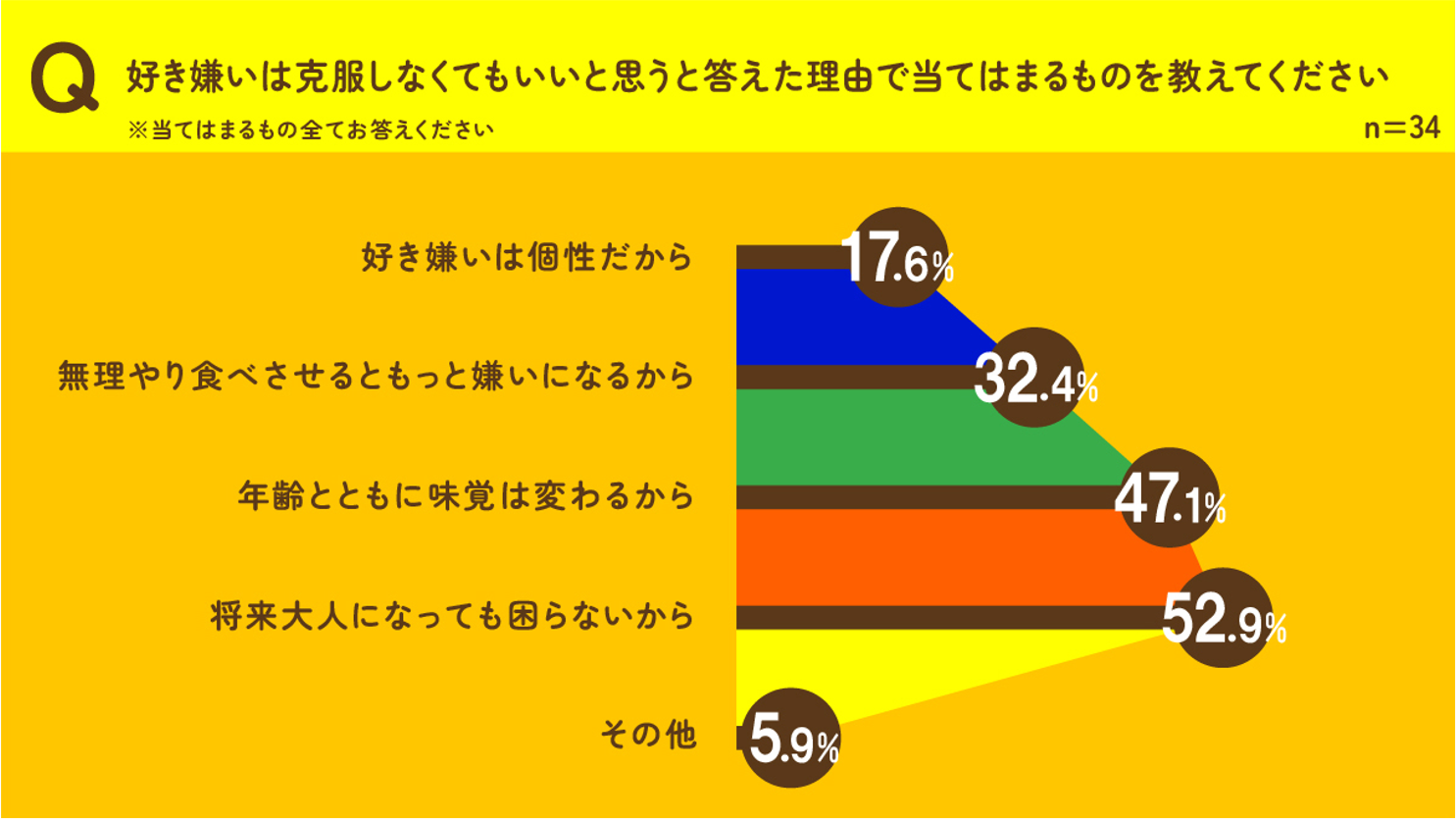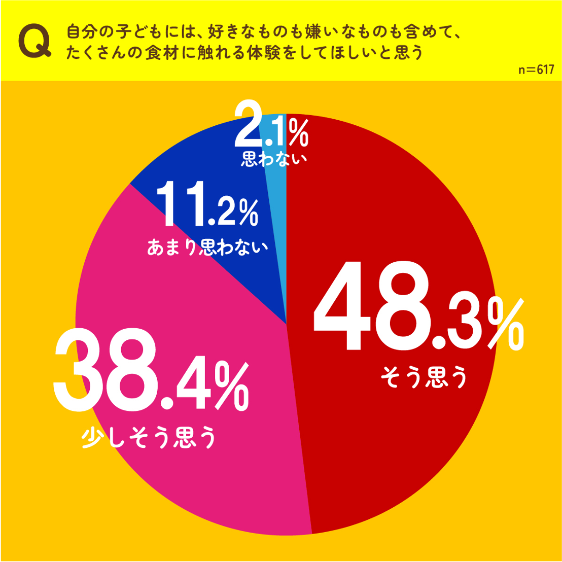 一方で、47.9% の親が「好き嫌いがあることは生活する上で影響があると思わない」と回答し、幼少期の経験があっても好き嫌いに対して生活する上で影響があると思わないことがわかりました。
