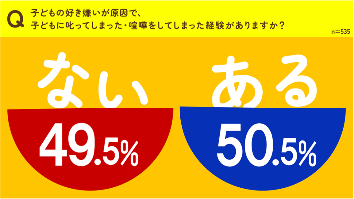 半数以上が子どもの好き嫌いで「叱る・喧嘩の経験がある」「ストレスを感じた」という結果も6割以上が「子どもの好き嫌いも個性だと思う」「もっと許容される風潮になってほしい」という意見も