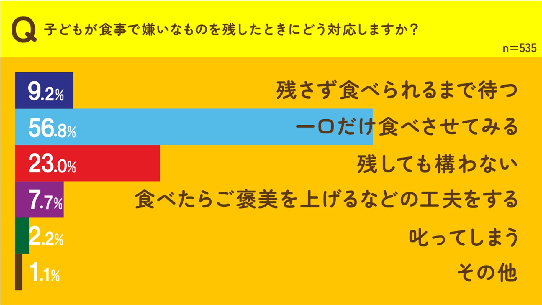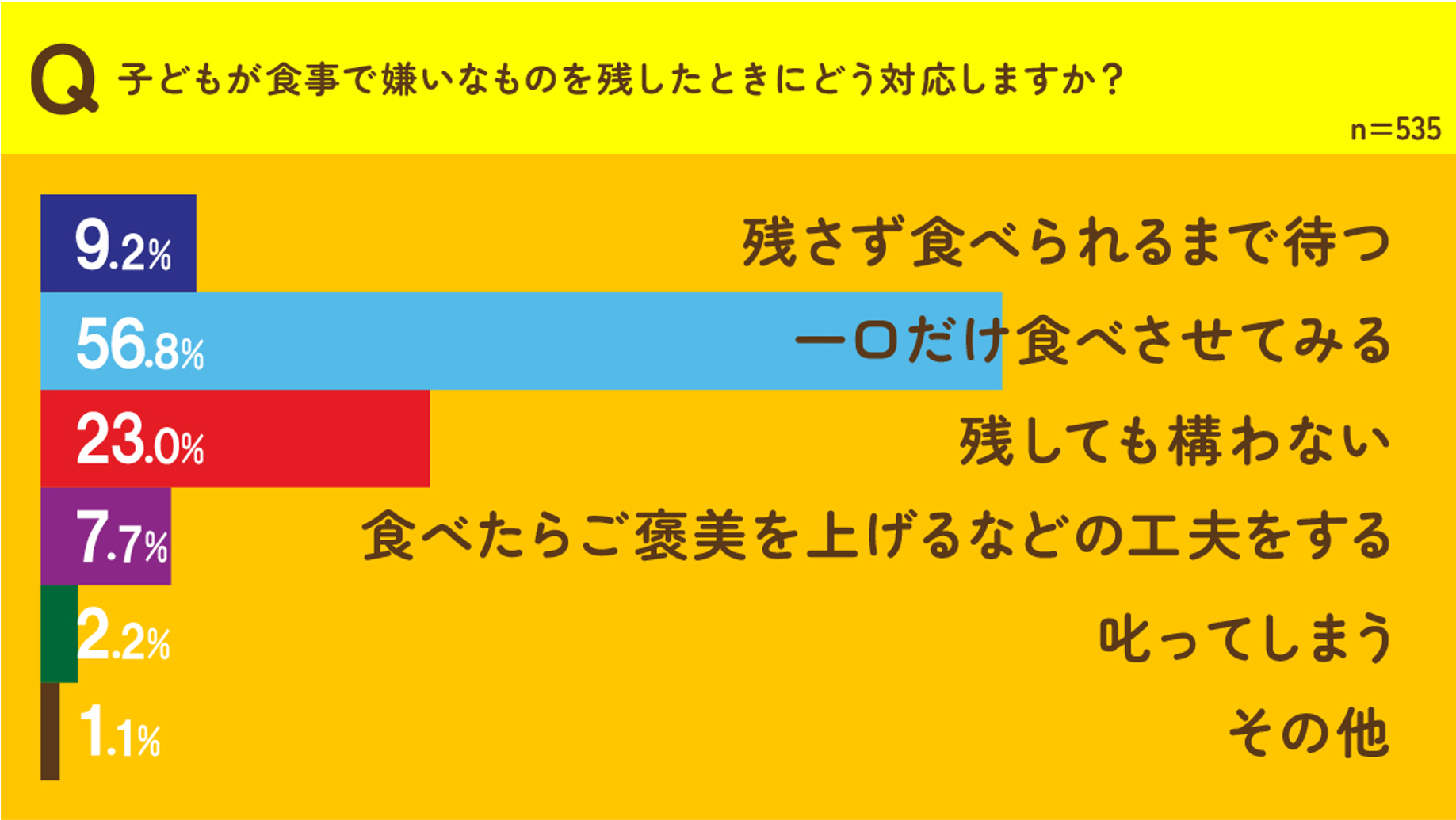 子どもが食事で嫌いなものを残した時の対応一位は、「一口だけ食べさせてみる」56.8%