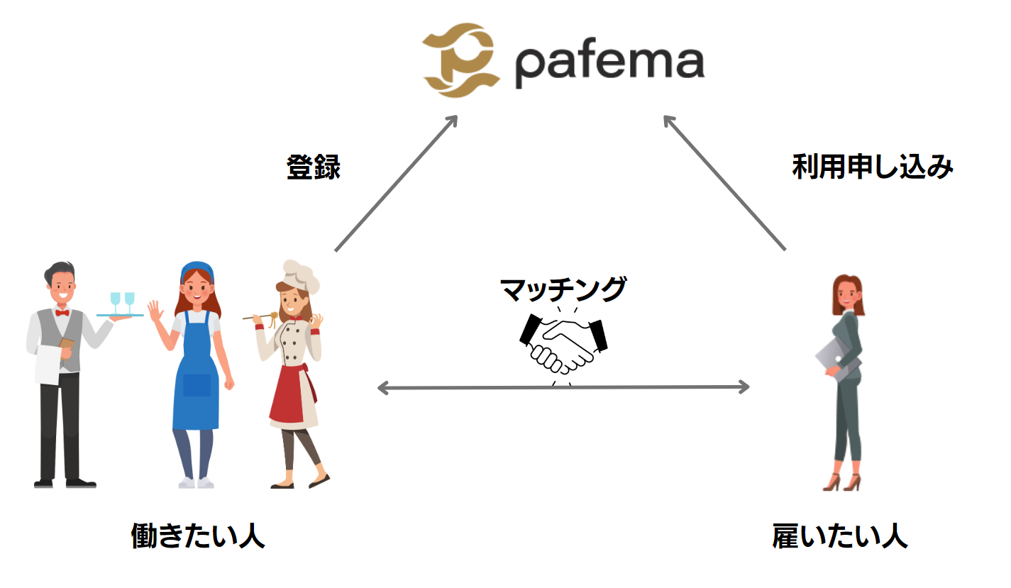 「パフェマ」とは、接客業に特化した人材マッチングサービスです。本サービスは、企業と働き手が抱える課題を解決し、豊かな生活と経済の活性化に貢献したいという想いのもとに誕生しました。現在、労働力人口の減少により、多くの企業は慢性的な人材不足に陥っています。特に飲食業界・宿泊業界といった接客業においてその傾向は顕著であり、労働力の確保は重要な課題となっています。一方、労働力人口とされる人々の中には、「育児や介護のため、働きたいけど働けない」、「身近に働ける環境がない」等の就労環境に課題があります。それらの人々に対し、就労機会及び適した労働環境を提供することで、接客業における労働力不足を解消することを「パフェマ」は目指しています。