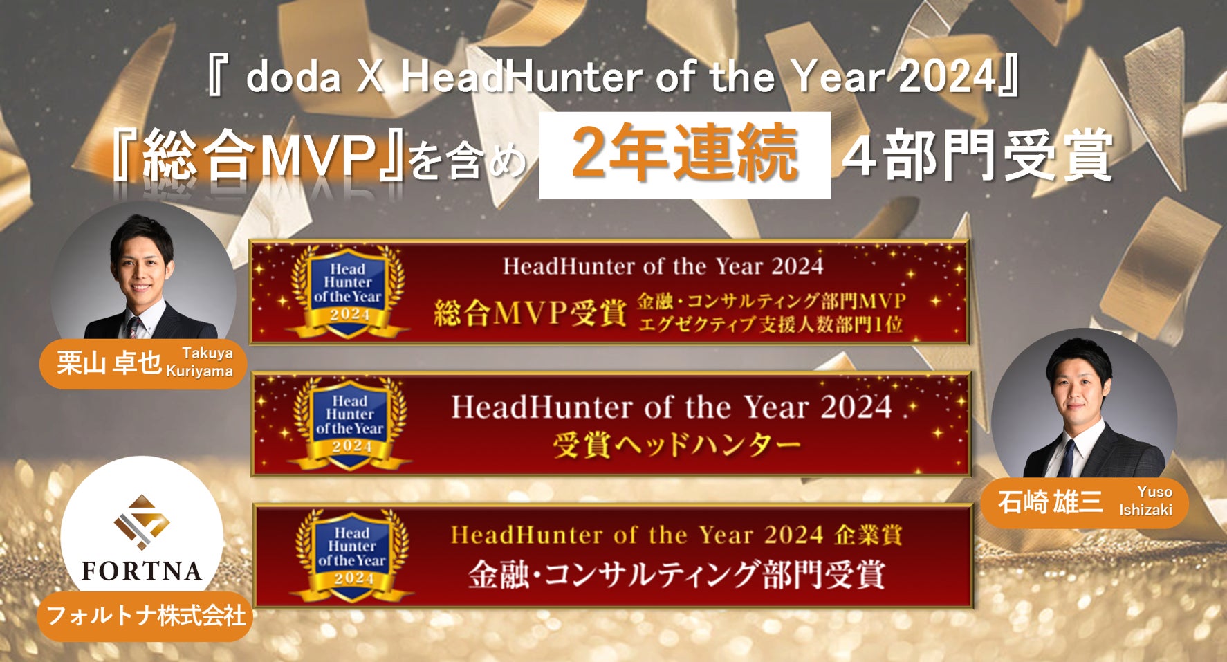 ハイクラス転職エージェントのフォルトナ株式会社(代表取締役:三石 真司、本社:東京都千代田区)は、パーソルキャリア株式会社が運営をするハイクラス転職サービス「doda X」主催「HeadHunter of the Year by doda X 2024」にて、総合MVPを含む4部門で表彰されました。