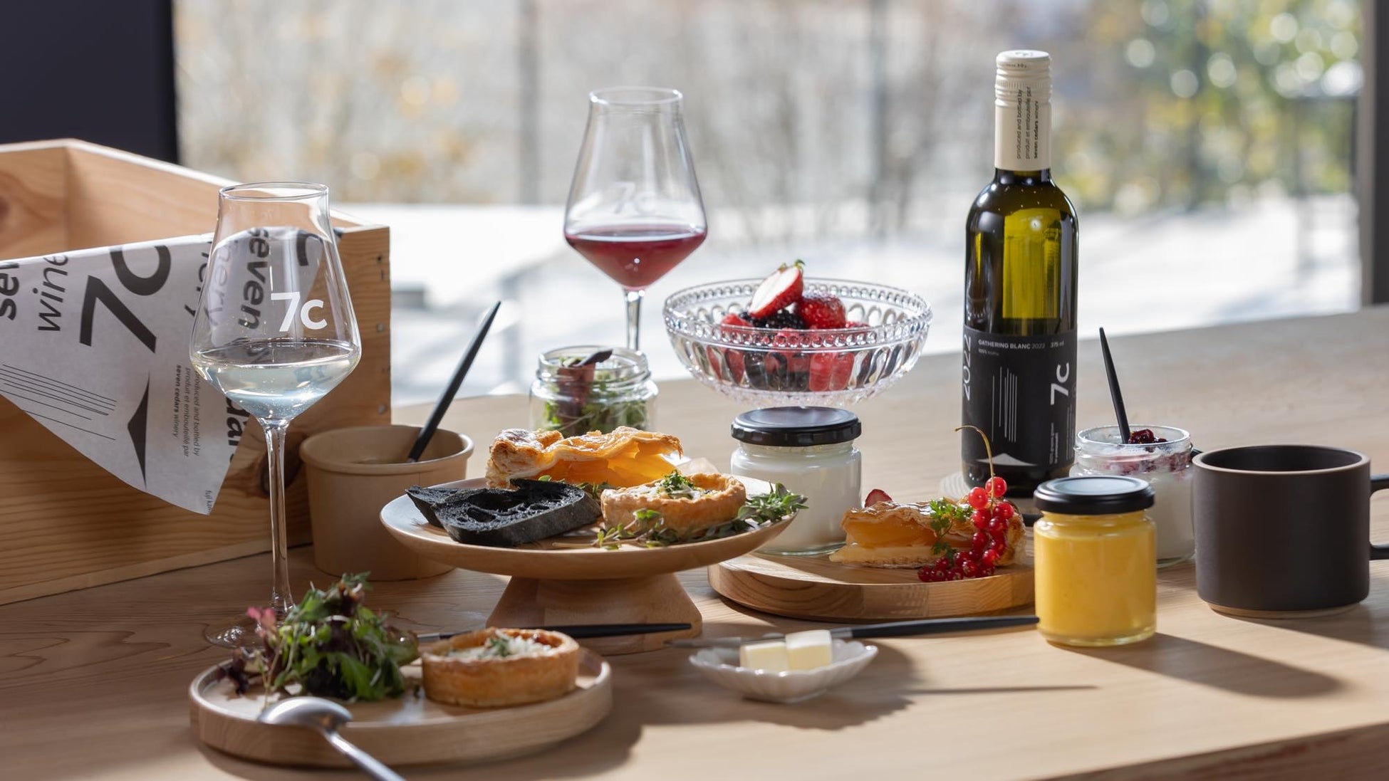 朝食は、ワイン箱に見立てた7cオリジナルのBOXの中に朝食セットを仕込み、各お部屋にお届けするスタイルとなっております。くつろぎの空間やプライベートガーデンの非日常感の中、7cのオリジナルワインとともに彩り豊かなお料理をゆっくりとお召し上がりいただけます。