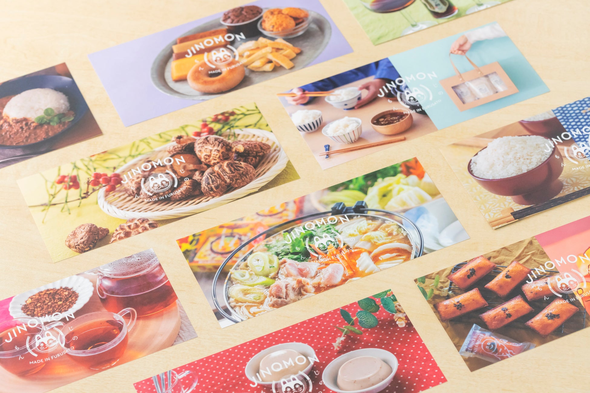 能登のお店の「じのもん」ふるさと情報付カード式カタログは、1商品1枚(表・裏)の構成で、1セット当たり10枚程度が同封されます。気になる1品を選んで注文し、食してふるさと能登のお店を応援できます。