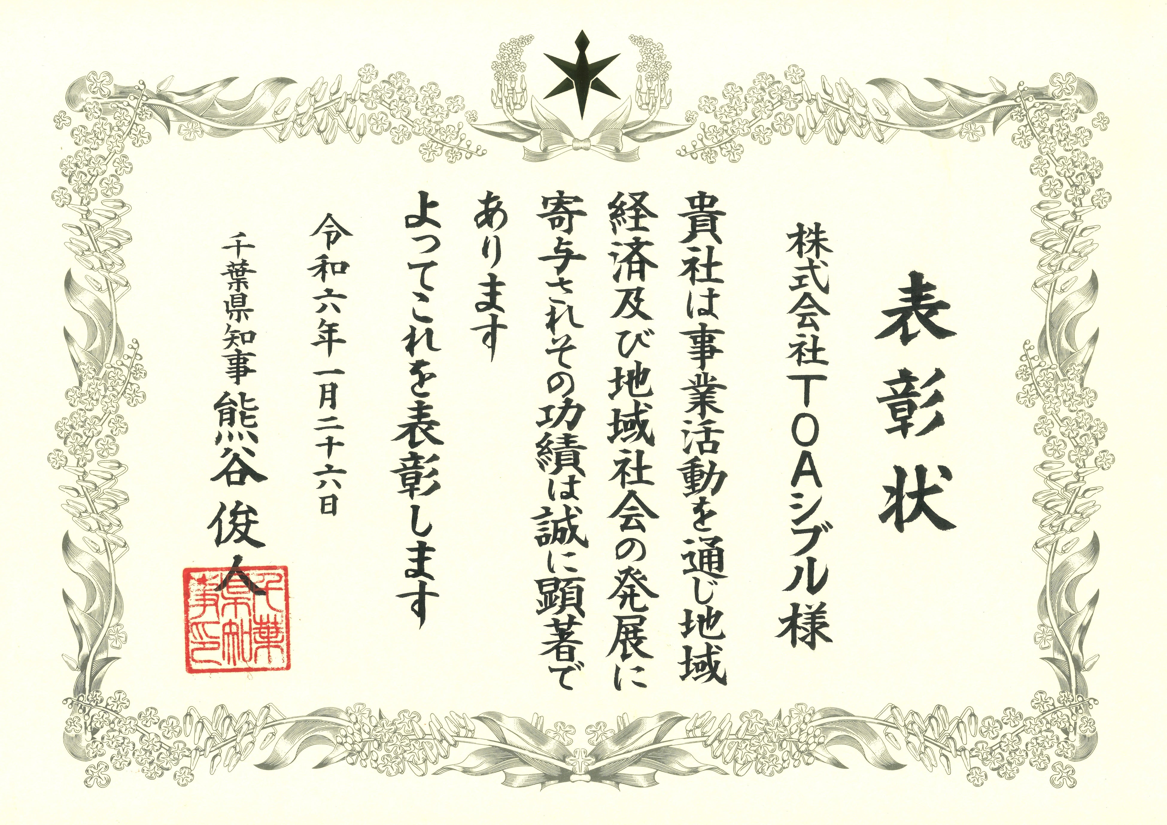 TOAシブルが「千葉のちから『中小企業・小規模企業表彰』」を受賞