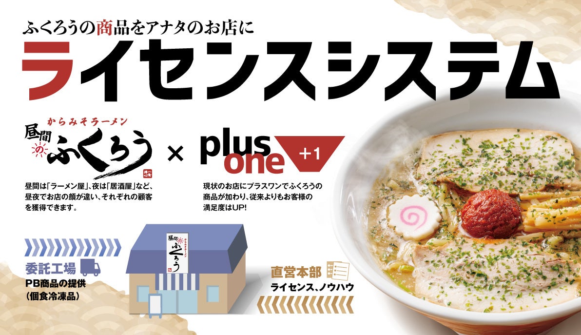 例えば夜のみ営業している居酒屋店舗にこのライセンスシステムを導入すれば昼間は「からみそラーメンふくろう」として、夜は本来の居酒屋として営業することも可能。さらに「プラスワン制度」があるので従来のメニューにふくろうのラーメンをプラスすることも可能となります。
