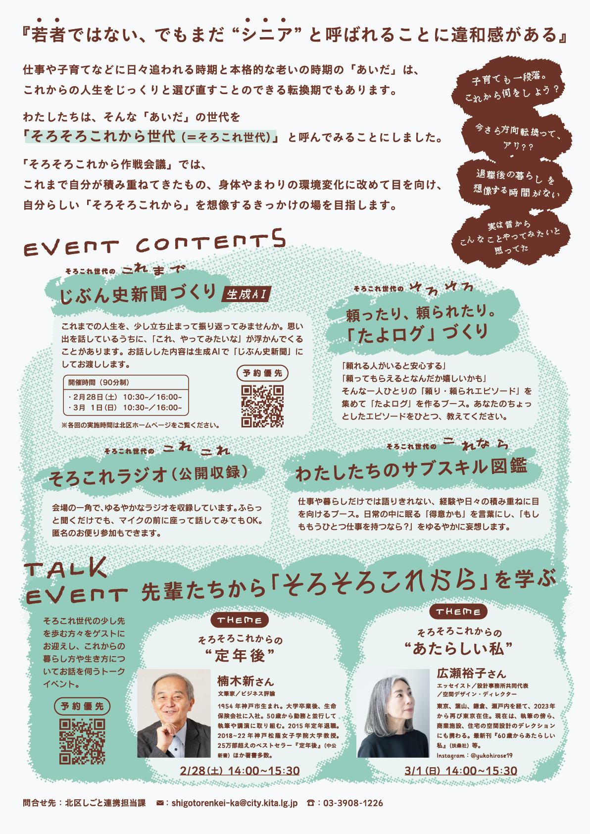 「若者」でも「シニア」でもない、人生の転換期を迎える"そろこれ世代"に向けた週末イベント「そろそろこれから作戦会議」を東京都北区にて2月27日〜3月1日開催