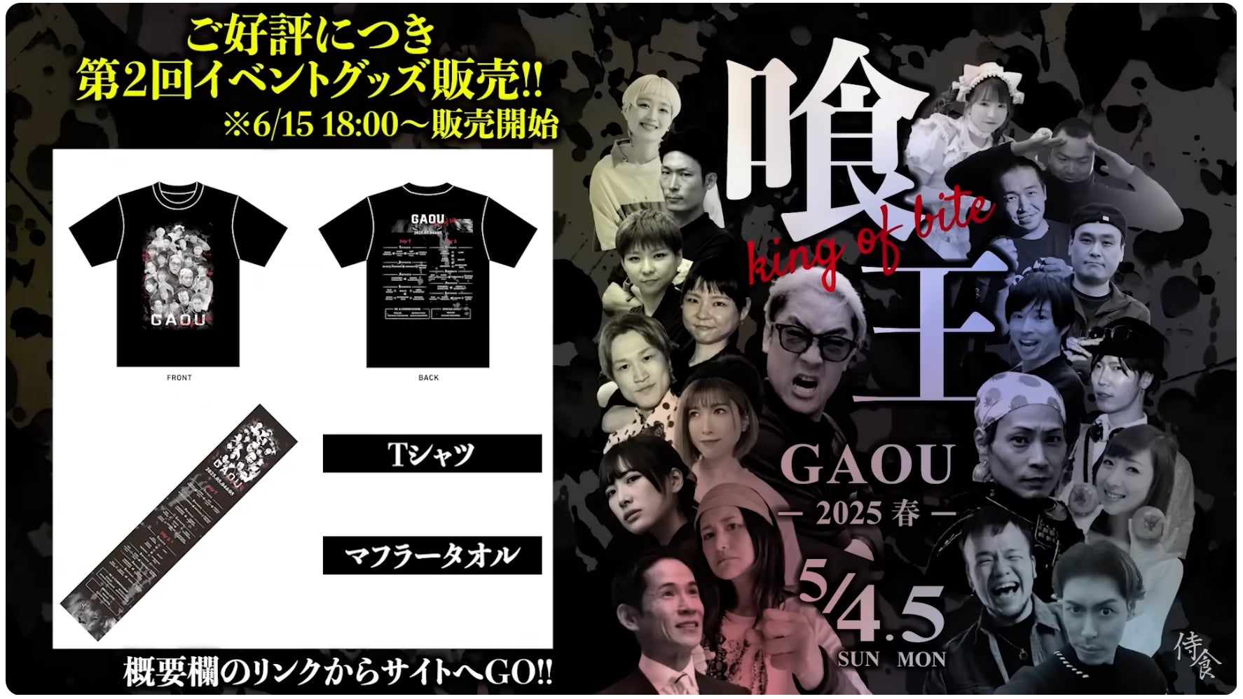 また、【第24回喰王】大食い頂上決戦 DAY1公開に合わせて、イベントグッズの販売も開始しております。白熱したバトルが繰り広げられた「喰王 -king of bite- 2025春」2days。このイベントのためだけに集結した、超豪華20名の出演者が大きくプリントされた圧巻のデザイン!会場で感じた一体感、彼らが織りなした数々の名シーンが鮮明に蘇ります。