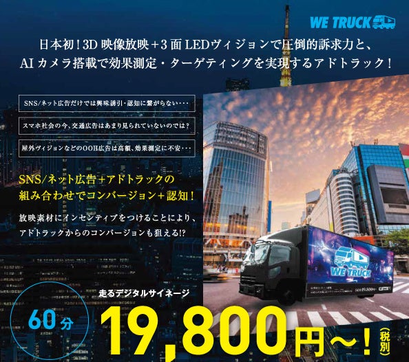日本初! 3D映像放映+3面LEDヴィジョンで圧倒的訴求力と、AIカメラ搭載で効果測定・ターゲティングを実現するアドトラック。