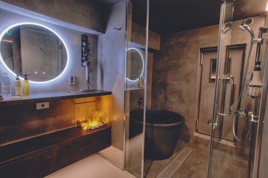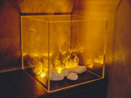 個室内には本物の炎のようにゆらぐ水蒸気された暖炉を設置。