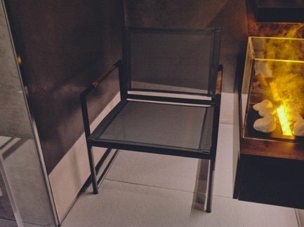 最高のリラックスのためにアームにチーク材を施した有名ホテルなどでも使用されている BREEZE CLUB CHAIR (ブリーズクラブチェア)をご用意。上品なグレーのパウダーコート仕上げで、シート生地はフランス・セルジュ・フェラーリ社の BATYLINE を使用しており、KUUで“ととのう“ための最高のチェアとして採用しております。
