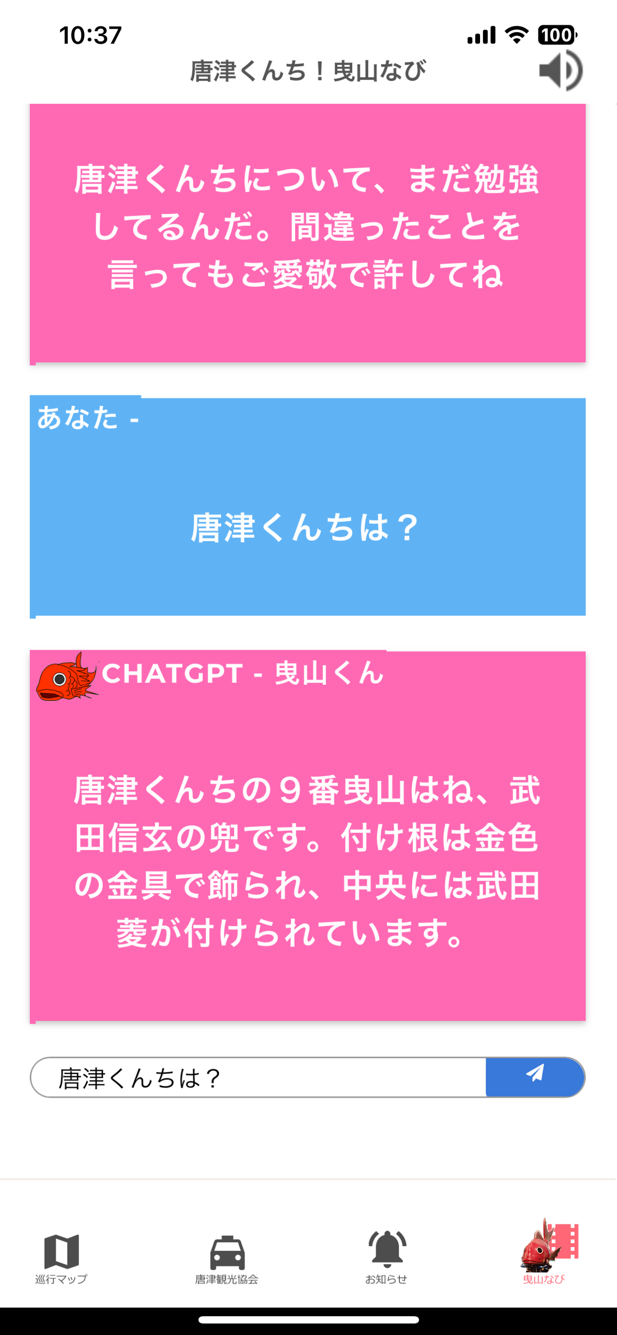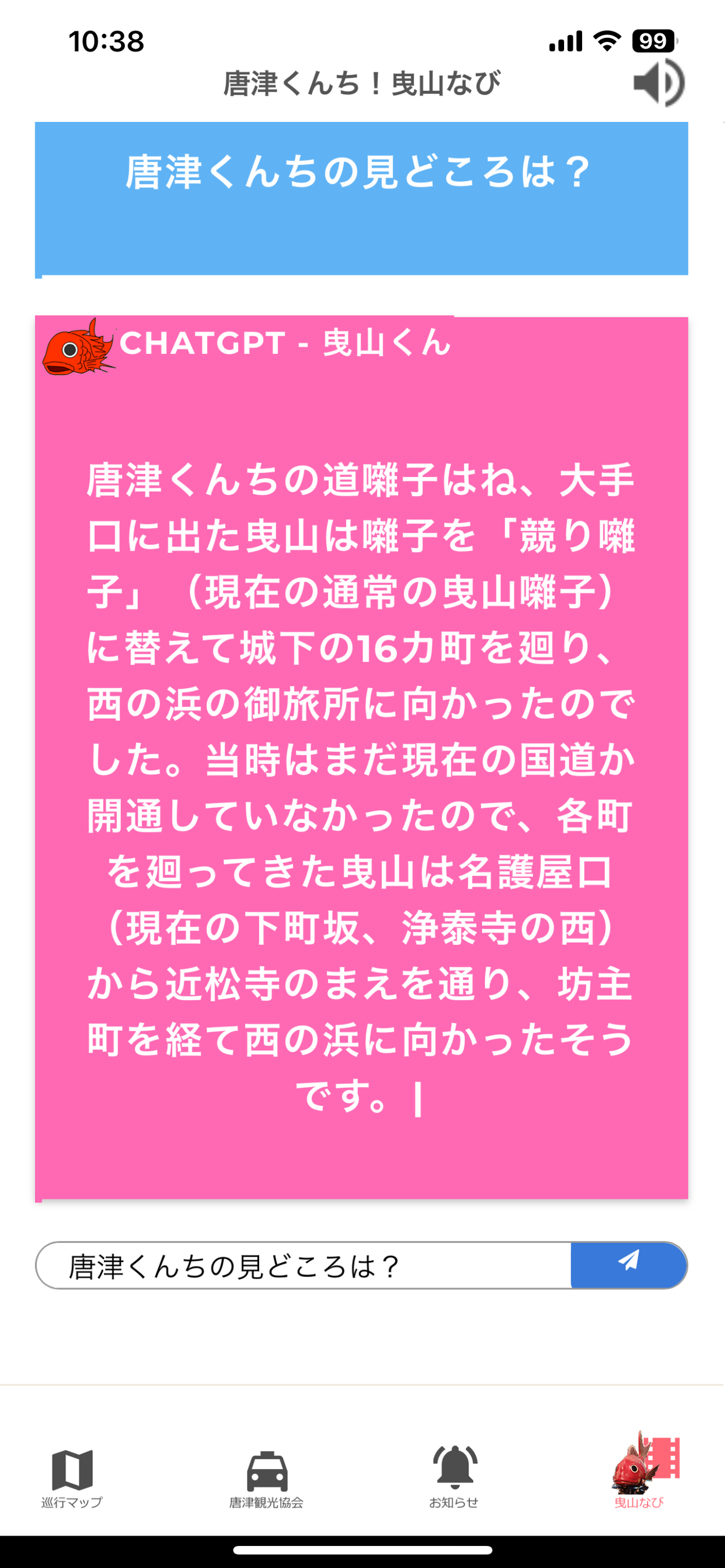 『曳山なび』ChatGPT のチャットは、「曳山くん」と呼ばれる「鯛」のアイコンをタッチすることで利用できます。