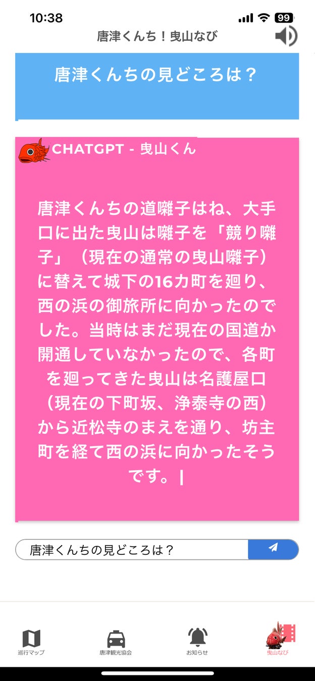『曳山なび』ChatGPT のチャットで唐津くんちに関する質問に答える AI チャット機能を備えたバージョンをリリース!観光客向けのアプリで完全無料