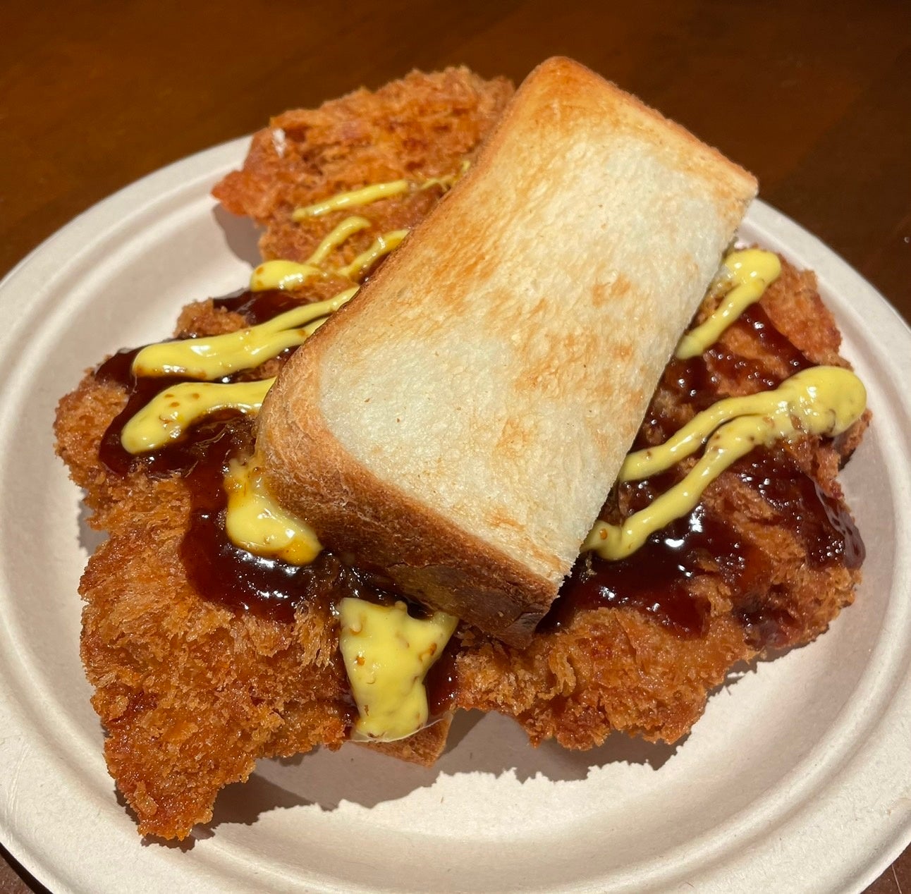 力士の手形サイズ約400g!超特大のチキンかつを、そのままかつサンドに!柔らかジューシーです!チキンカツの上には自家製ソースと粒マスタードをたっぷりかけ湯種製法のもちもち食パンにサンドしました。意外とペロリといけちゃうかも!?
