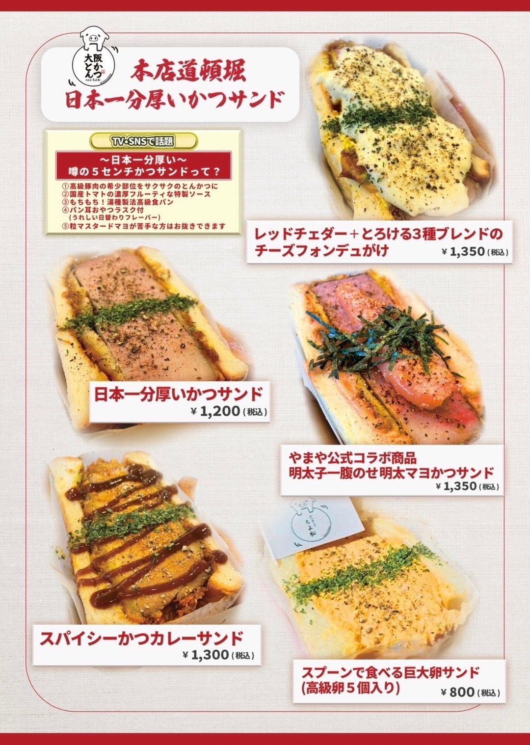 元力士の店主が作る!テレビやSNSでおなじみの「日本一分厚いかつサンド」の2店舗目が道頓堀にオープンしました。