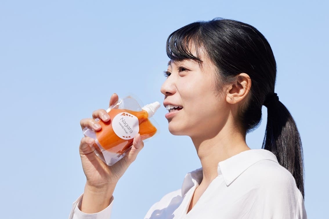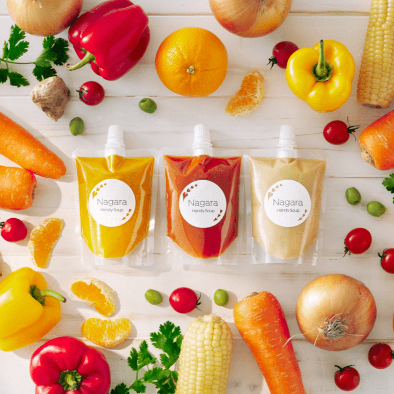 Nagaraハンディスープは、そのまま飲める飲み口付きパウチの本格的な冷製スープ。レシピは大手外資系ホテルでシェフを務めた岡嶋伸忠氏が監修。白いトウモロコシ「ピュアホワイト」や雪の中で育った「ふかうら雪人参」、特別な“アイメック農法”で作ったフルーツトマト「フォレストフルティカ」など素材からこだわった本格的な味わいを、いつでもどこでも手軽に楽しめるのが特徴です。化学調味料・保存料・着色料不使用。美味しさ、手軽さ、健康を高いレベルで提供します。