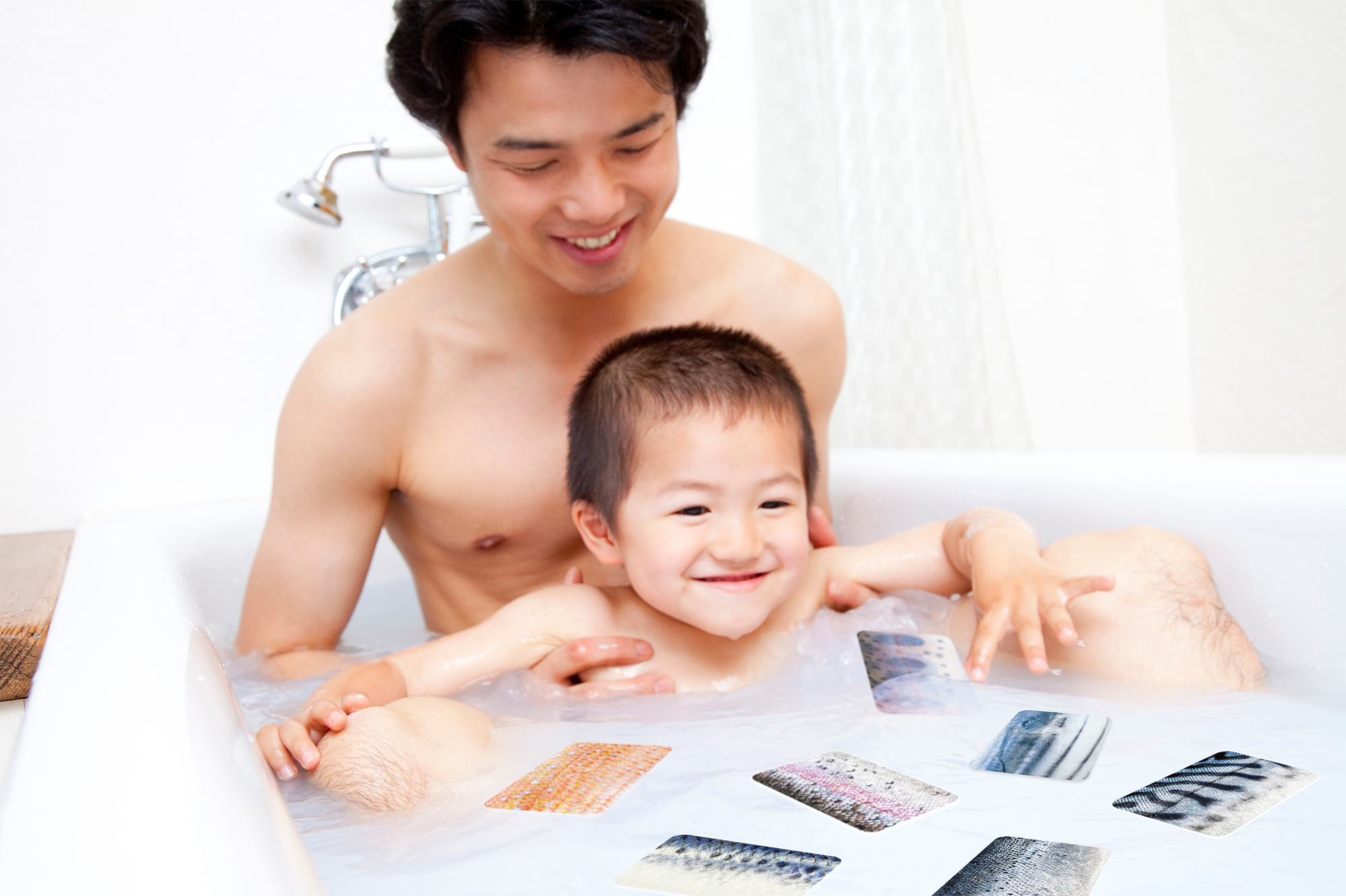 耐水仕様のため、お風呂や家庭用プールなどの水場での使用も可能です。水に浮かぶ特殊素材によって、水面にかるたを浮かべてゲームをする事ができます。