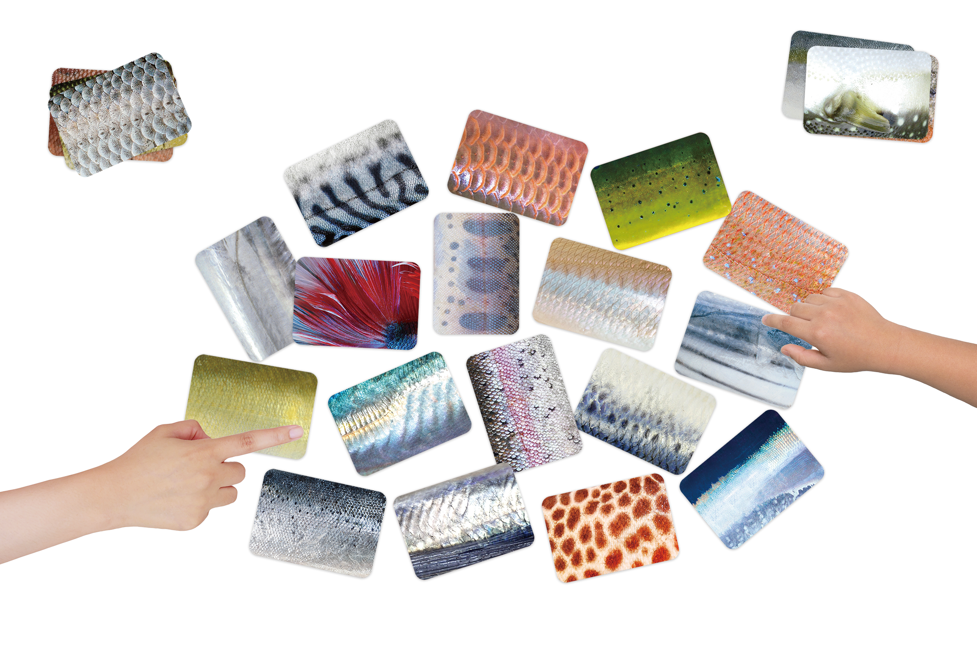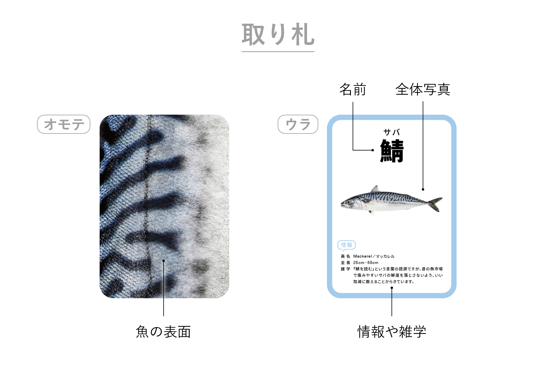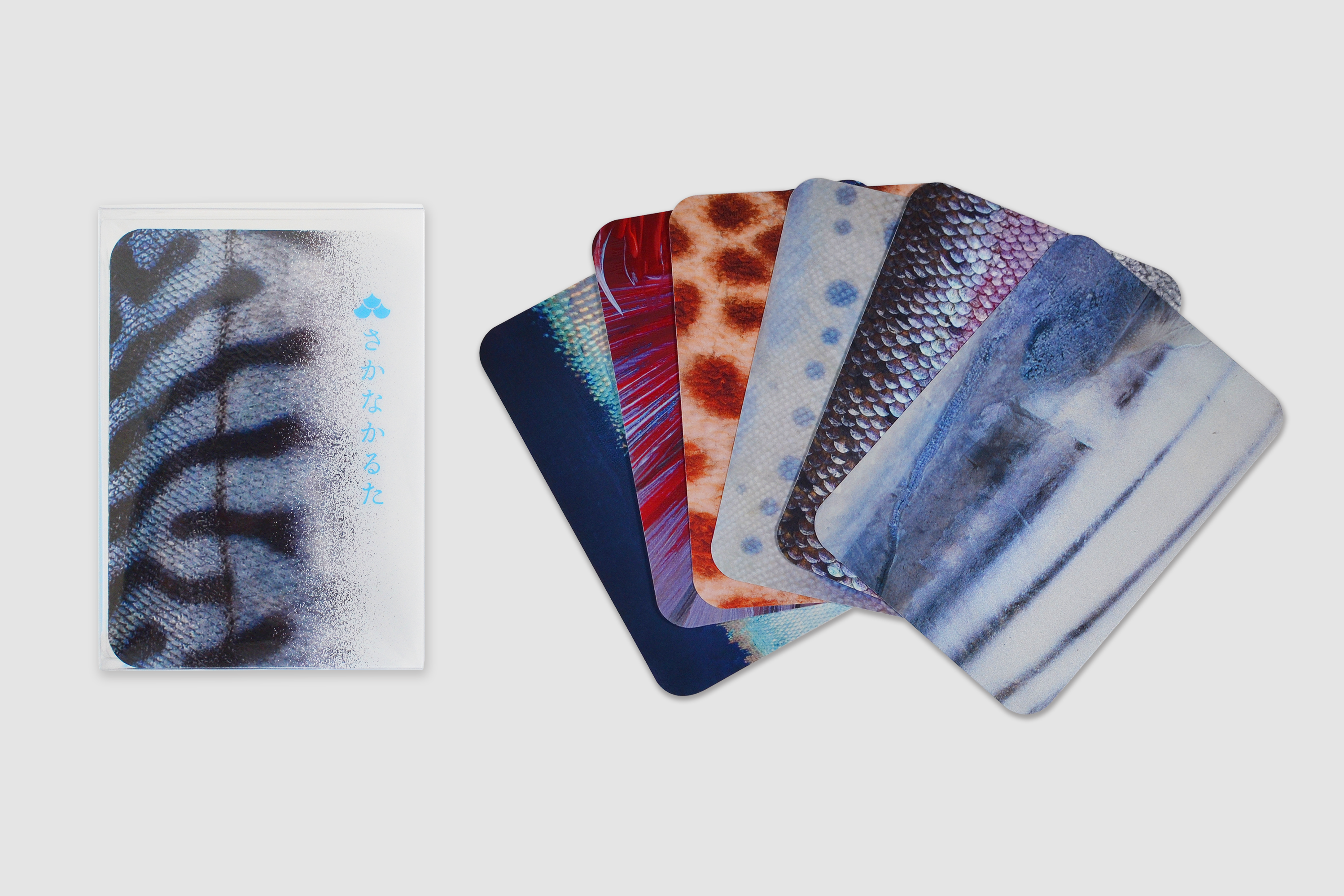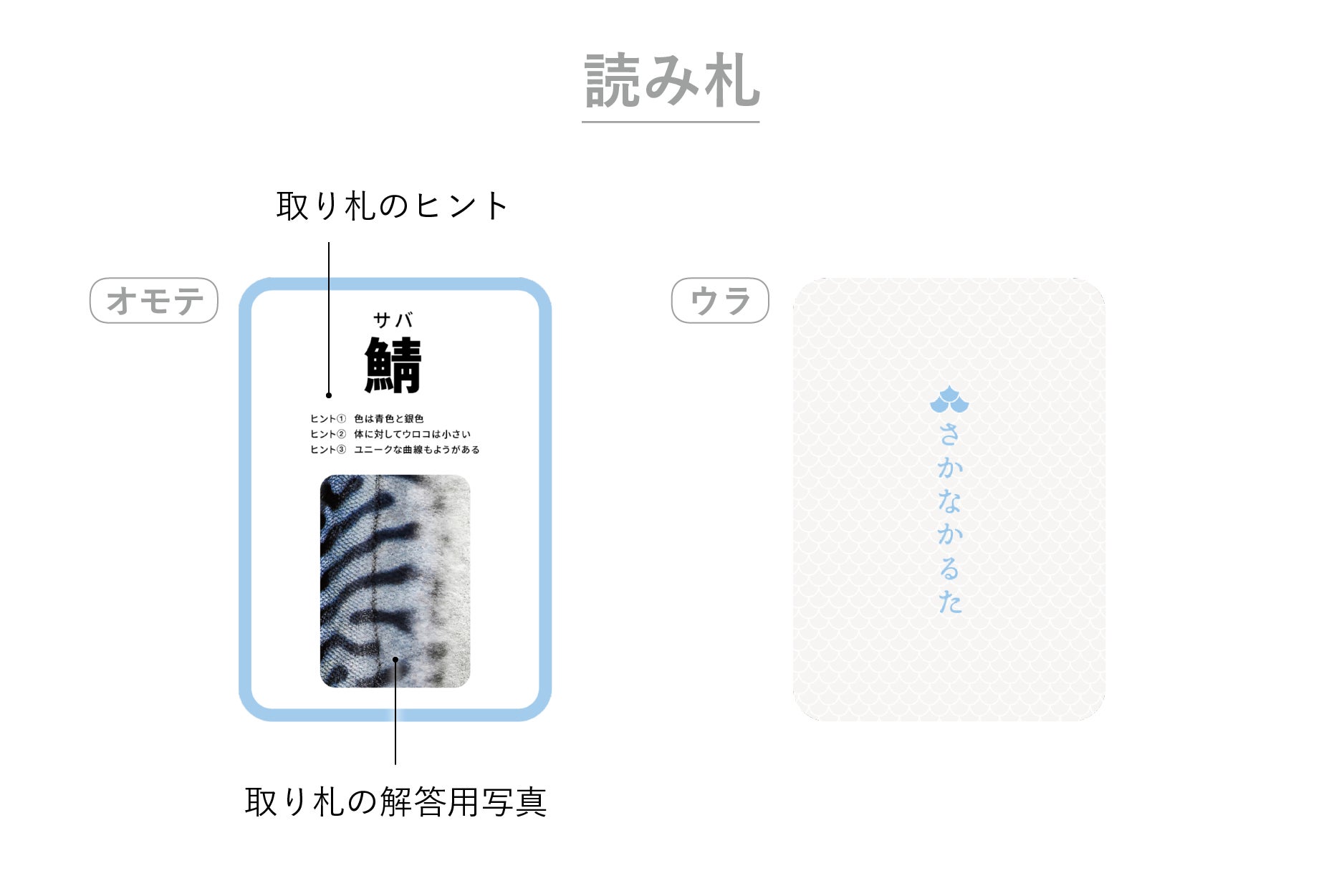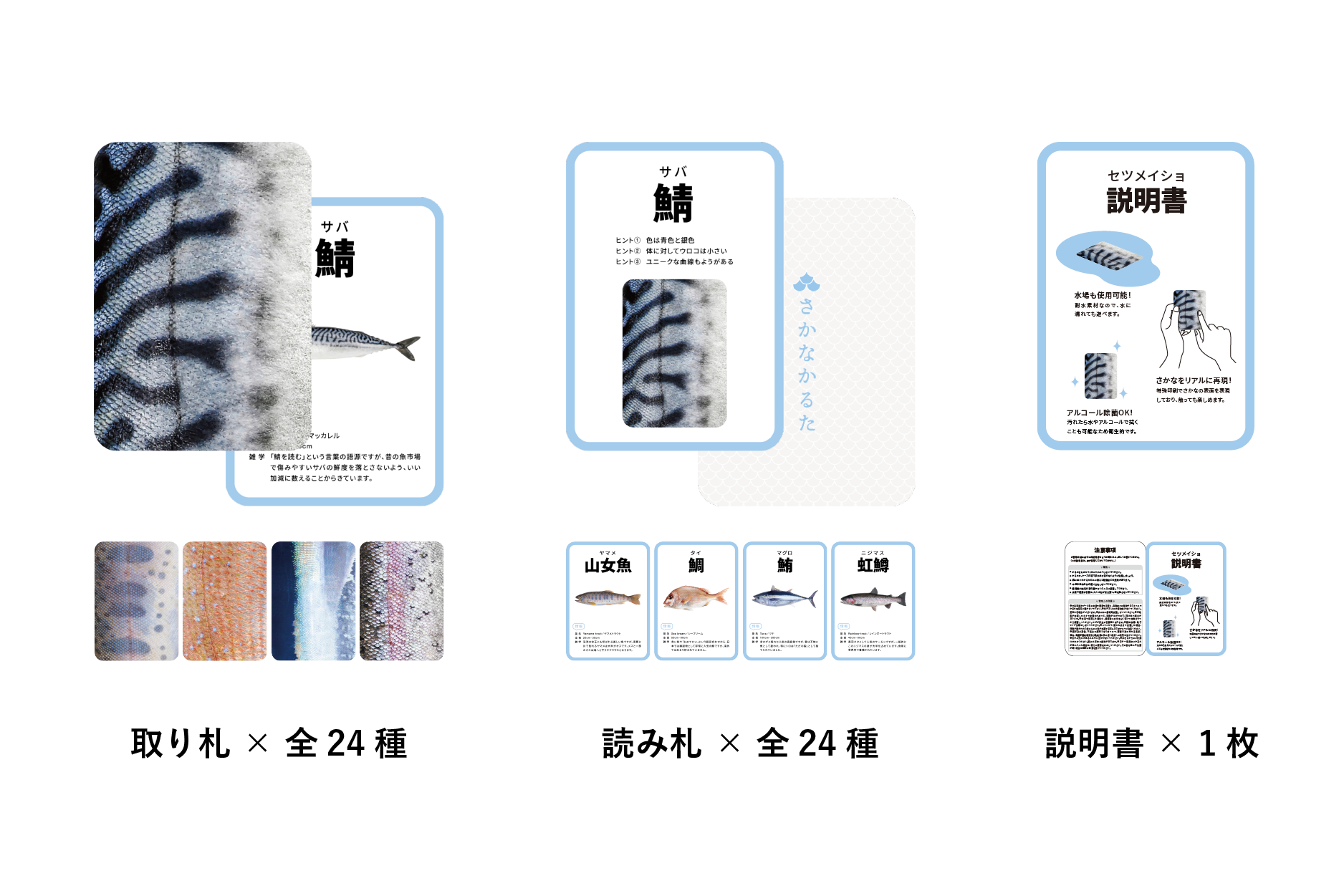 特殊な印刷技術によって本物の魚のような質感を再現しており、魚の表面(ウロコやキラめき等)のみで何の魚かを当てるというかるたです。素材には合成紙ユポを使用しており、お風呂などの水の中でも遊ぶことができる耐水仕様です。