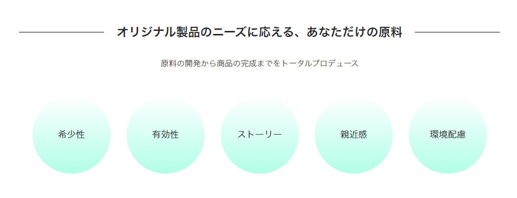 一般的に出回っている原料だけを使用するのではなく、こだわりの材料から抽出した成分を使用することで更なる付加価値を付けることが可能です。