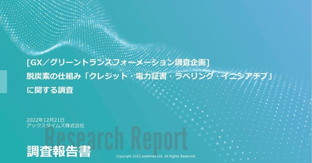 ビジネス解像度を高めるリサーチ情報サービスを展開するアックスタイムズ株式会社(所在地:大阪府大阪市中央区、代表取締役:橋本規宏)は、グリーントランスフォーメーション「GX」を促す制度の仕組みを体系的に整理した調査報告書「脱炭素の仕組み「クレジット・電力証書・ラベリング・イニシアチブ」に関する調査」を、2022年12月21日にリリースしたことをお知らせします。