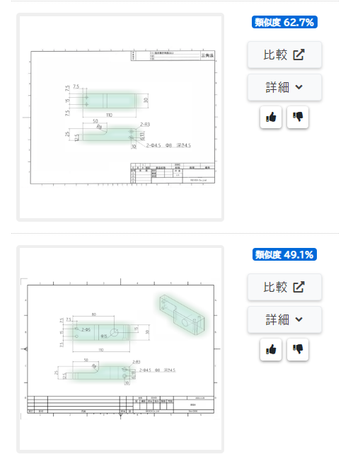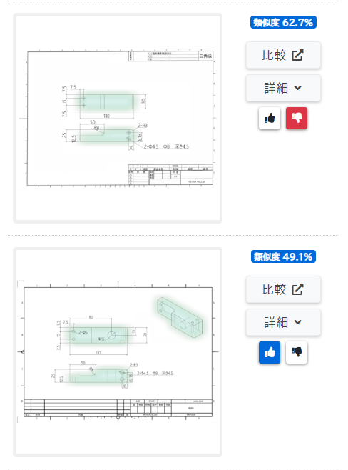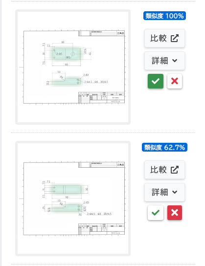 この度、 SellBOT(セルボット)の類似検索結果に新たに評価機能【☑️/ ❌】が追加されました。 類似度が高い図面を『 ☑️』で評価いただくと、 AIが学習し更に精度の高い見積りや類似検索結果を得ることが可能になります。