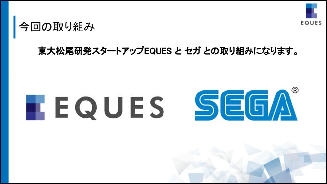 AIという新規の分野で、まさに学生発ベンチャーの若いEQUESと弊社のような老舗のエンタテインメントの会社が連携できたことは、今後にもつながると思っています。日本はAIでは若干の出遅れ感がありますが、今後もこうした取り組みなどを通して業界全体としても水準を高めていきたいと思っております。」