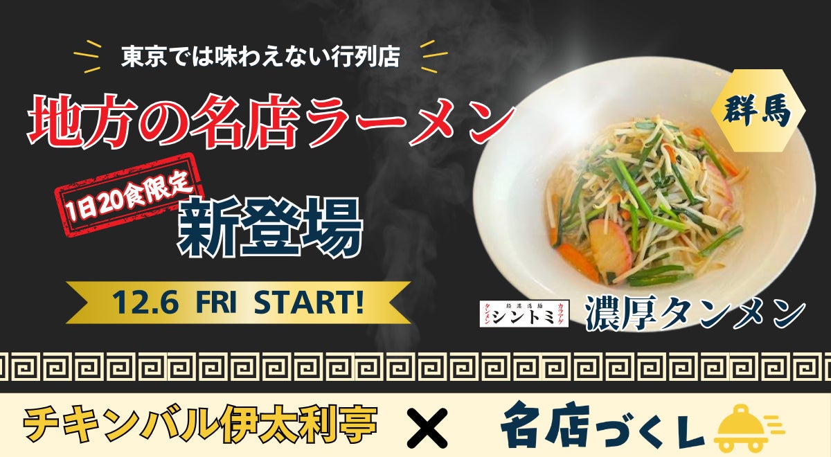 12月6日(金)より「極濃湯麺シントミ」濃厚タンメンの販売を開始する「チキンバル伊太利亭」は、新サービス【名店づくし】と業務提携を行い、普段東京では味わうことのできない地方の名店ラーメンを販売いたします。