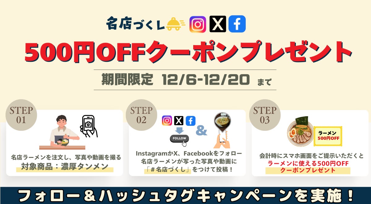 東陽町「チキンバル伊太利亭」では、販売開始に伴い、フォロー&ハッシュタグキャンペーンを実施いたします。極濃湯麺シントミの濃厚タンメンを食べて、キャンペーンに参加すると、ラーメンに使える500円OFFクーポンプレゼントいたします。たくさんのご参加お待ちしております。