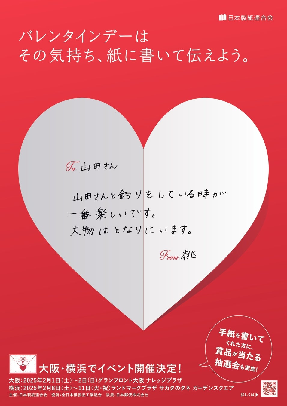 日本製紙連合会は、「片思いの相手」「恋人・夫婦」「家族」「友達」などの、大切な思いを伝えたい相手に対してのラブレターを来場者に綴っていただく、「ラブレターイベント2025 バレンタインデーは、手紙を書こう。」を、大阪2月1日(土)~2月2日(日)、横浜2月8日(土)~2月11日(火・祝)まで開催します。