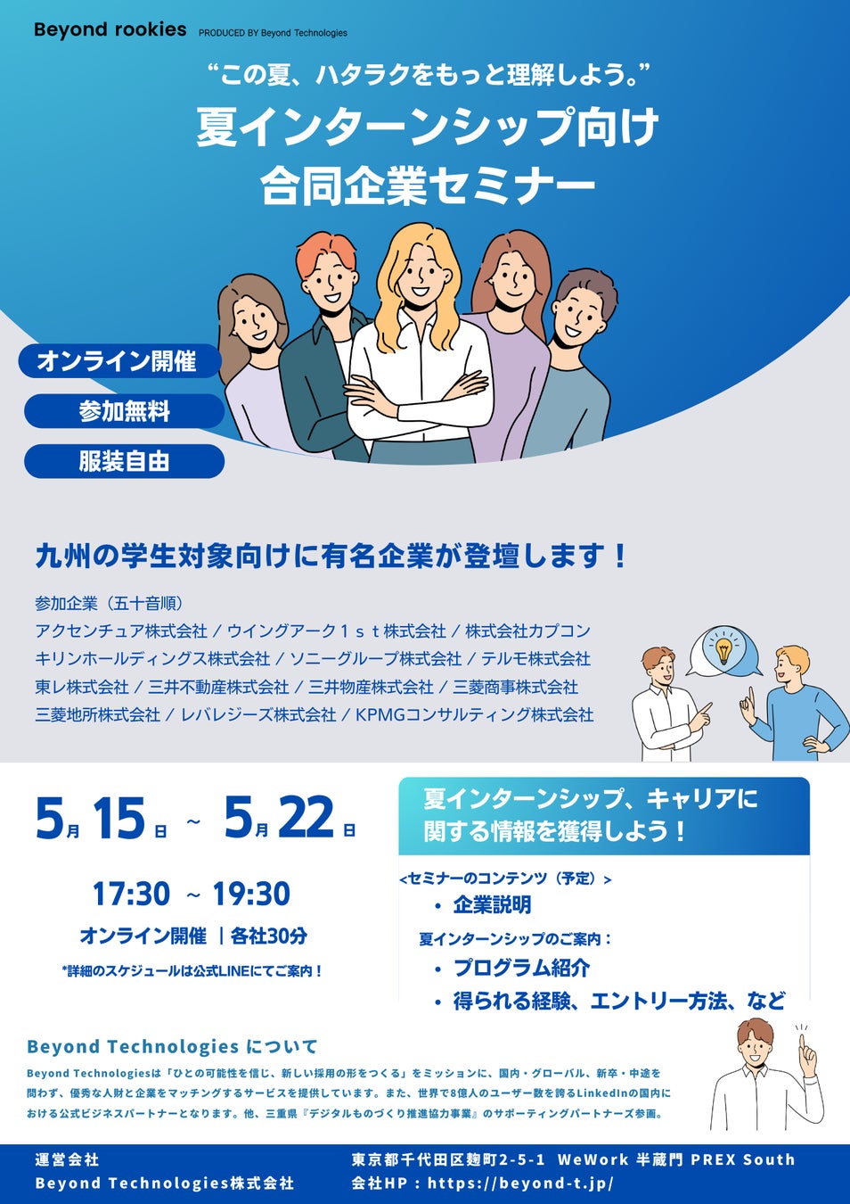 Beyond Technologiesが運営するBeyond rookiesは、首都圏の学生と比較して就職活動の情報が届きにくく、均等な機会提供が行われていない「地方学生の就職活動の”不”を解消すること」を目指しています。当社は「"ひと"の可能性を信じる」を理念として掲げ、地方の大学に通われる学生の可能性を信じ、共感を得た企業を誘致しながらセミナーを開催しました。