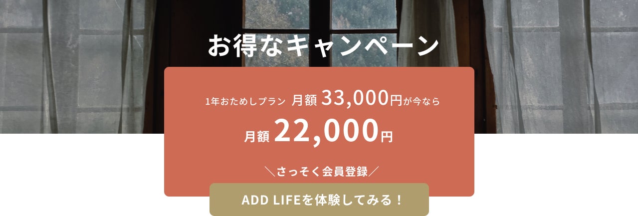 GrowHack株式会社(本社:東京都千代田区、代表取締役:原和義)は2023年1月18日(水)より、空き家を活用した2拠点生活実現サービス、ADD LIFE(アドライフ)のα版を公開します。ADD LIFEでは全国の家具・家電・ネット付きの空き家に短期間・定額で住むことができます。料金が安価のため、自宅を解約・引っ越し不要で2拠点生活を始めることができます。