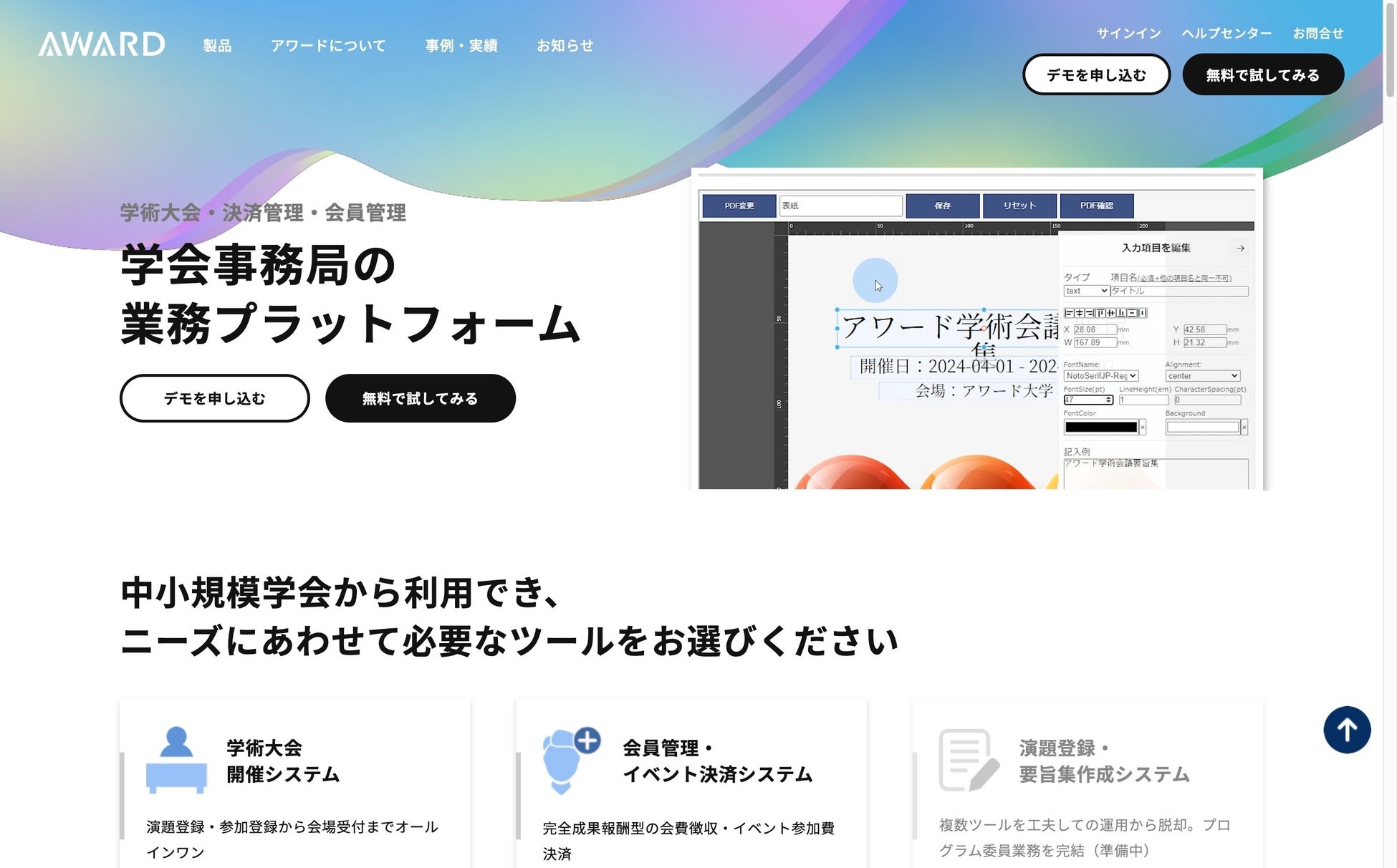 「AWARD(アワード)」は、中小規模学会から利用できる学術大会・国際会議開催システムです。 事務局担当者の負担が多く掛かる、演題登録、参加登録(クレジットカード決済機能)、受付け業務の3業務はもちろん、プログラム作成機能も充実し抄録集のペーパーレス化も行える学術大会のリアル・オンライン・ハイブリッド開催ツールです。研究現場の研究者たちの負担を軽減し、物理的・経済的コストを削減を目指しパッケージ価格30万円(税別)で提供されています。