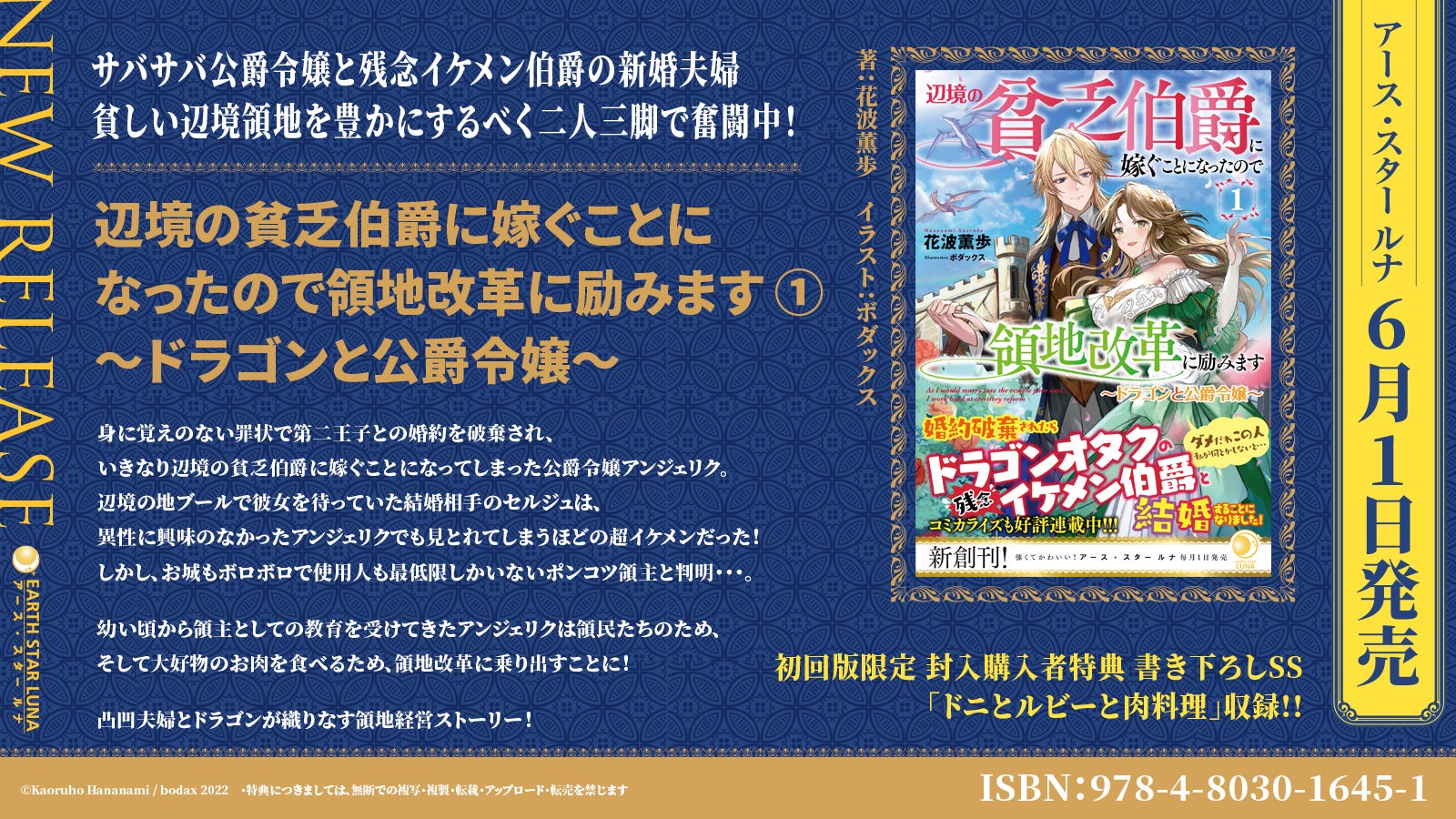 株式会社アース・スター エンターテイメント(東京都品川区)が2022年6月1日(水)より創刊するノベルレーベル【アース・スター ルナ】の新刊にて「辺境の貧乏伯爵に嫁ぐことになったので領地改革に励みます (1) ~ドラゴンと公爵令嬢~」を同日発売いたします。