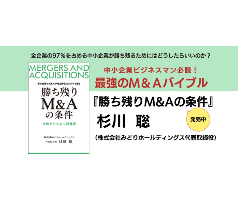 激変する経済環境の中、全企業の97%を占める中小企業が生き残り、成長し続けるためには何が必要なのでしょうか?年間500件、買い手としてM&Aに取り組む、株式会社みどりホールディングス 代表取締役 杉川聡が、12年間の実績をもとに、本書『勝ち残りM&Aの条件~令和を生き抜く経営術~』で、経営の最前線で戦う中小企業経営者に向けて、令和の時代を勝ち抜く手段としてのM&A(企業の合併・買収)を活用した成長戦略をわかりやすく解説する一冊です。