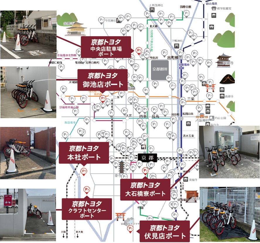 京都トヨタは、本社をはじめ6か所にシェアサイクル専用駐輪場(以下、「ポート」)を設置し、来客の方や地域の方々、また社員の営業活動や福利厚生の一環として新たな移動手段の提供を行います。今後も順次設置場所を増設予定で、地域の移動手段を増やしていくことで、インクルーシブなサービスの提供を目指すClewと共に、より住みやすいまちづくりを目指して地域に貢献していきます。