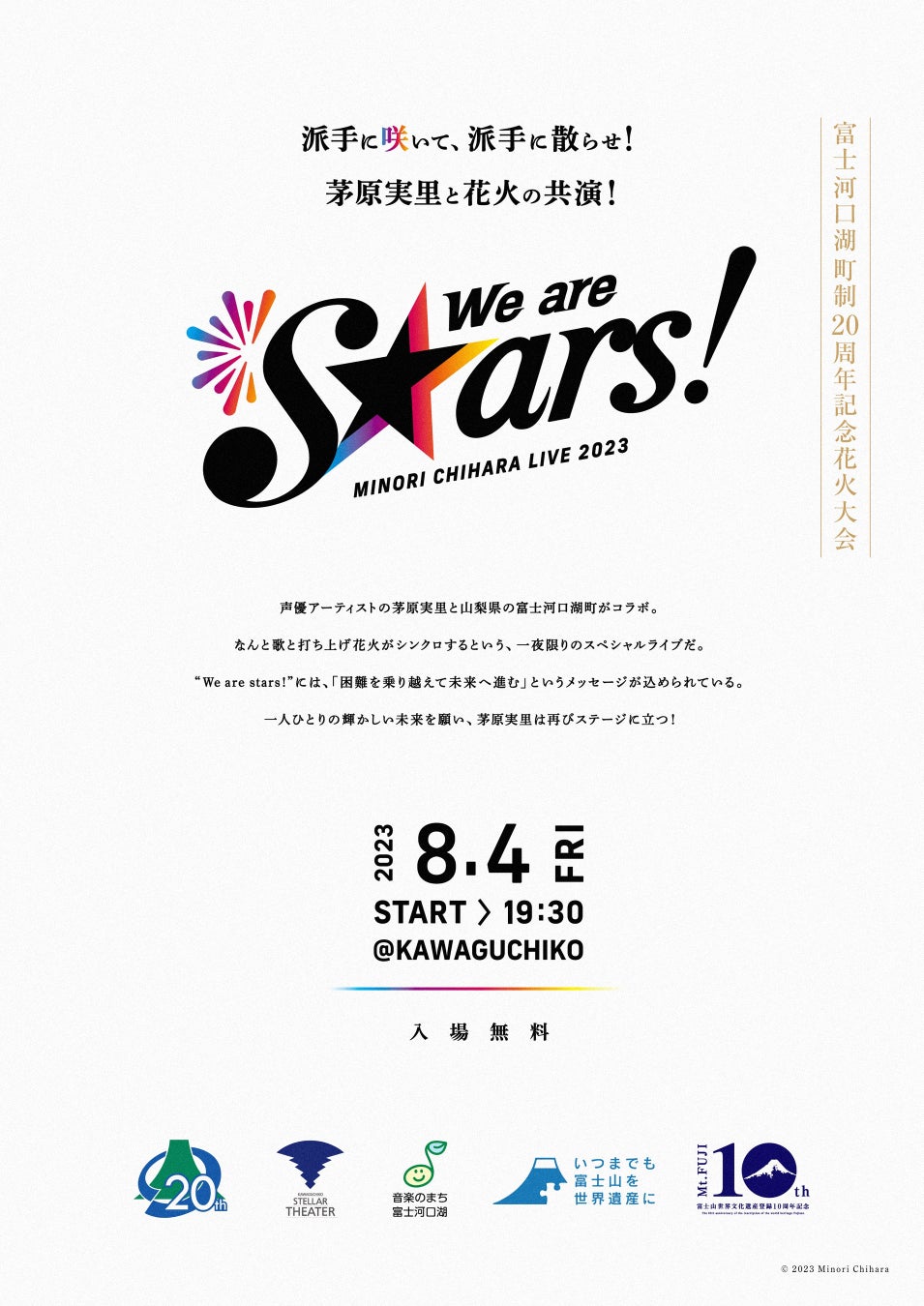 2023年8月4日(金)、声優アーティストの茅原実里と山梨県の富士河口湖町がタッグを組み、『富士河口湖町制20周年記念花火大会 茅原実里 LIVE 2023 "We are stars!"』を開催する。