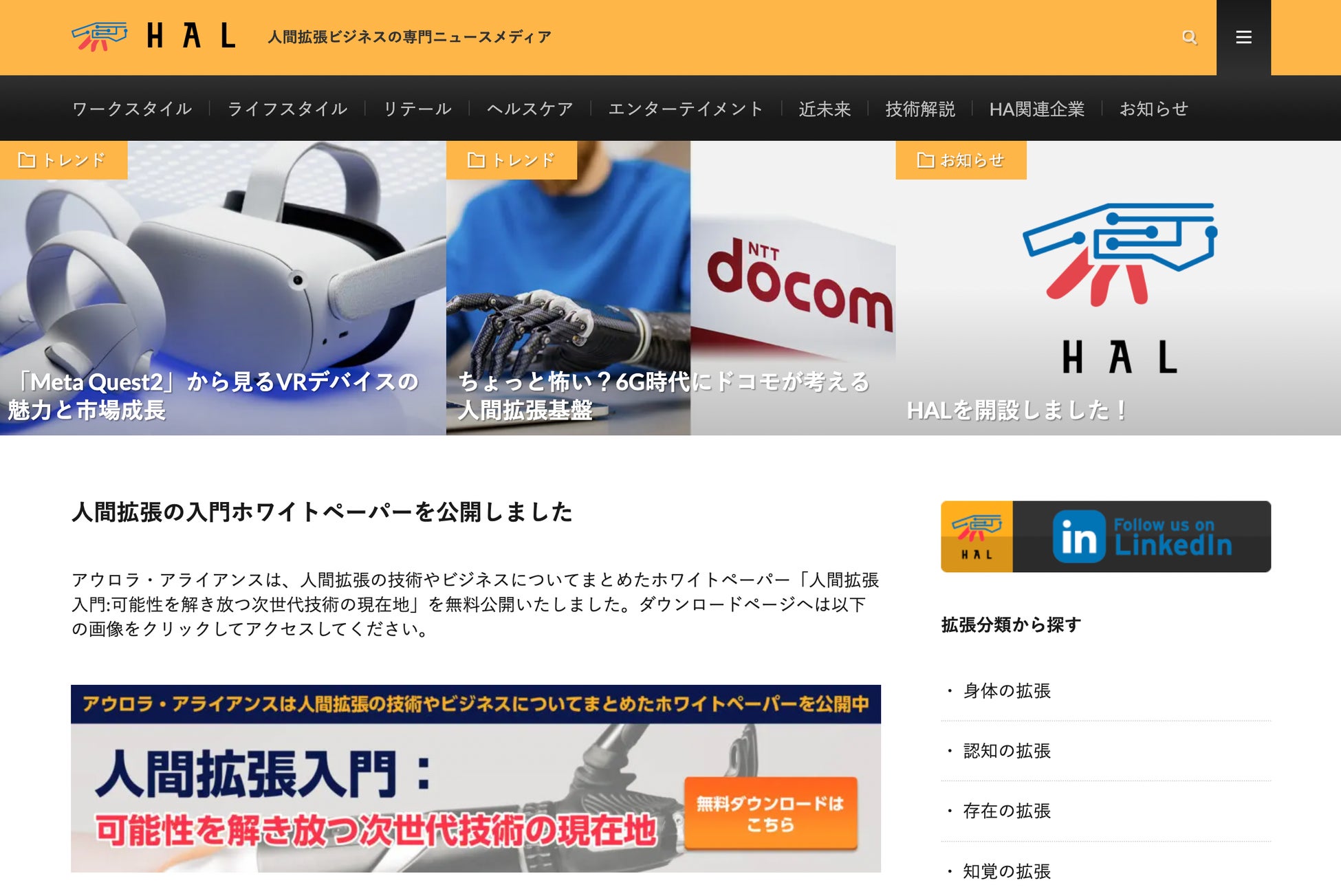 アウロラ・アライアンスは、人間拡張専門メディアであるHuman Augmentation Labo(以下、HAL)にて、人間拡張や関連技術に関するニュースを発信しています。また、調査結果をまとめたホワイトペーパーを発行しており、これまでに2つのホワイトペーパーを公開しました。