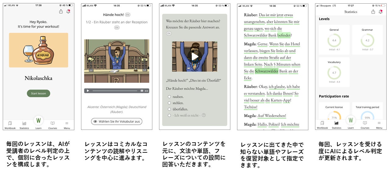 特にドイツ語学習者には、英語学習と違い、自分に合った教材を見つけるのが難しい、教材自体が少ないといったお悩みをお持ちの方が多いと思われます。Wunderblaの場合は、AIが語学レベルを判断し、受講者個別に合ったレッスンを構成するため、このようなお悩みにも対応いたします。