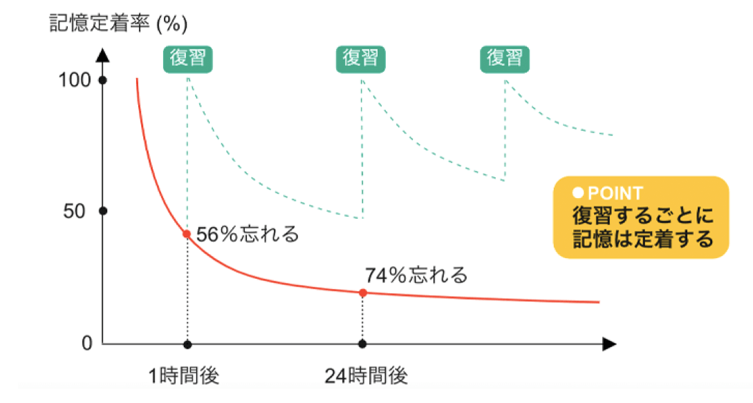 エビングハウスの忘却曲線の理論によると、人は一度記憶した内容のうち74%を一日後には忘れてしまうといわれています。そのため長期記憶を形成するには繰り返しの学習が欠かせません。Wunderblaの場合は、AIが受講者の進捗に合わせながら忘却曲線を意識したタイミングで復習の機会を繰り返し提供するため、文法や語彙、フレーズが自然に長期記憶として定着します。