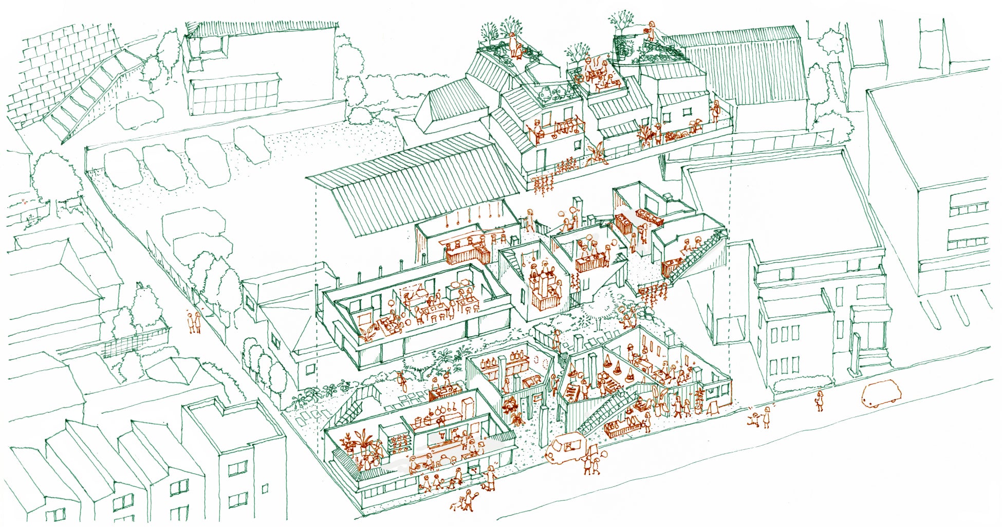 近年は、経年による老朽化のために建て替えの話が上がりましたが、綺麗さっぱり刷新するのではなく、少しずつ、店舗の営業を続けながら、地域と溶け合うように更新していく計画案を考えています。そこで、減築・新築・店舗移転・改修と段階的に遷移するプロセスを導入しています。建築自体は形を変えながら、それでも「新横浜食料品センター」として動的に保存されていく建築を提案しています。