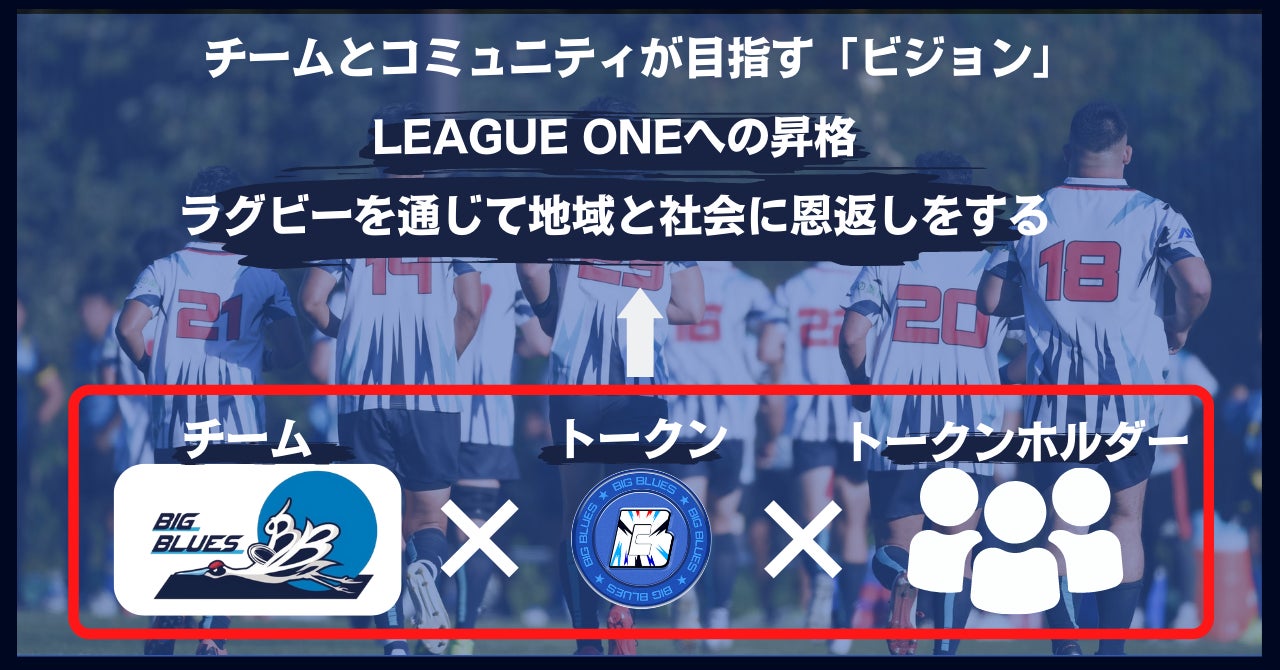 BIG BLUESはトークンを活用することで、「試合に勝ちLEAGUE ONEへの昇格」そして「ラグビーを通じて地域と社会に恩返しをする」この両輪をビジョンに掲げ、前進して参ります。