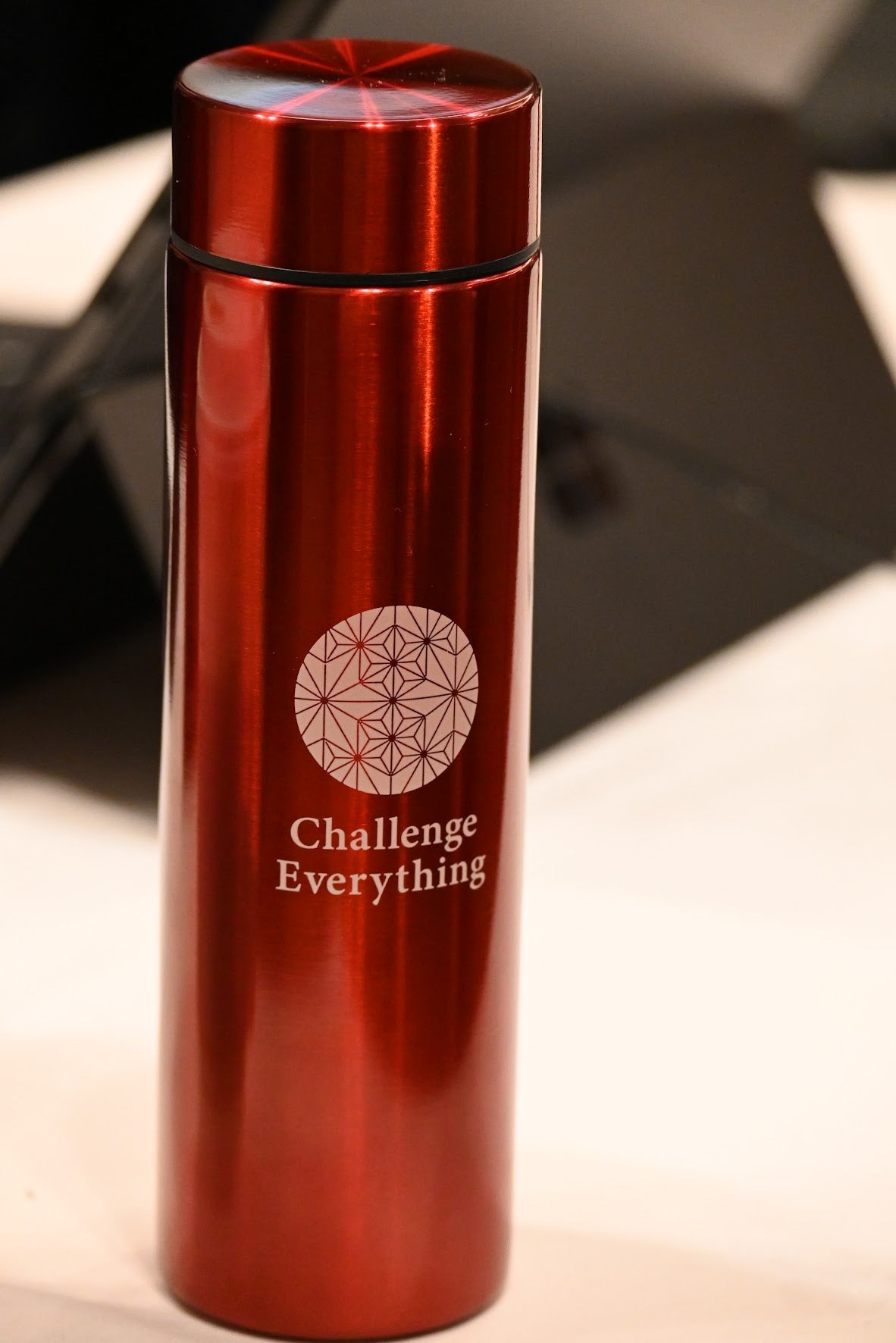 (上:オリジナルのマイボトル 中・下:メンバーにフードロス削減を呼びかける木村会長)