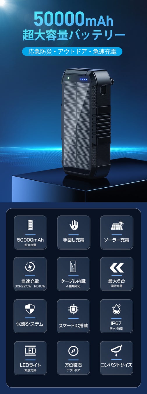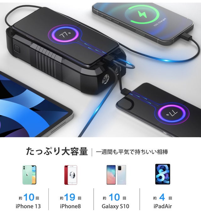 日常利用だけでなく、災害やアウトドアでも使える!手回し充電とソーラー充電機能を搭載、さらに、4種類の(急速充電)ケーブルが内蔵され、最大6台の機器に同時充電できます。お客様のニーズに合わせ、豊富なラインナップを揃えて技術革新し性能アップさせた、最新版の超大容量バッテリーが誕生します!